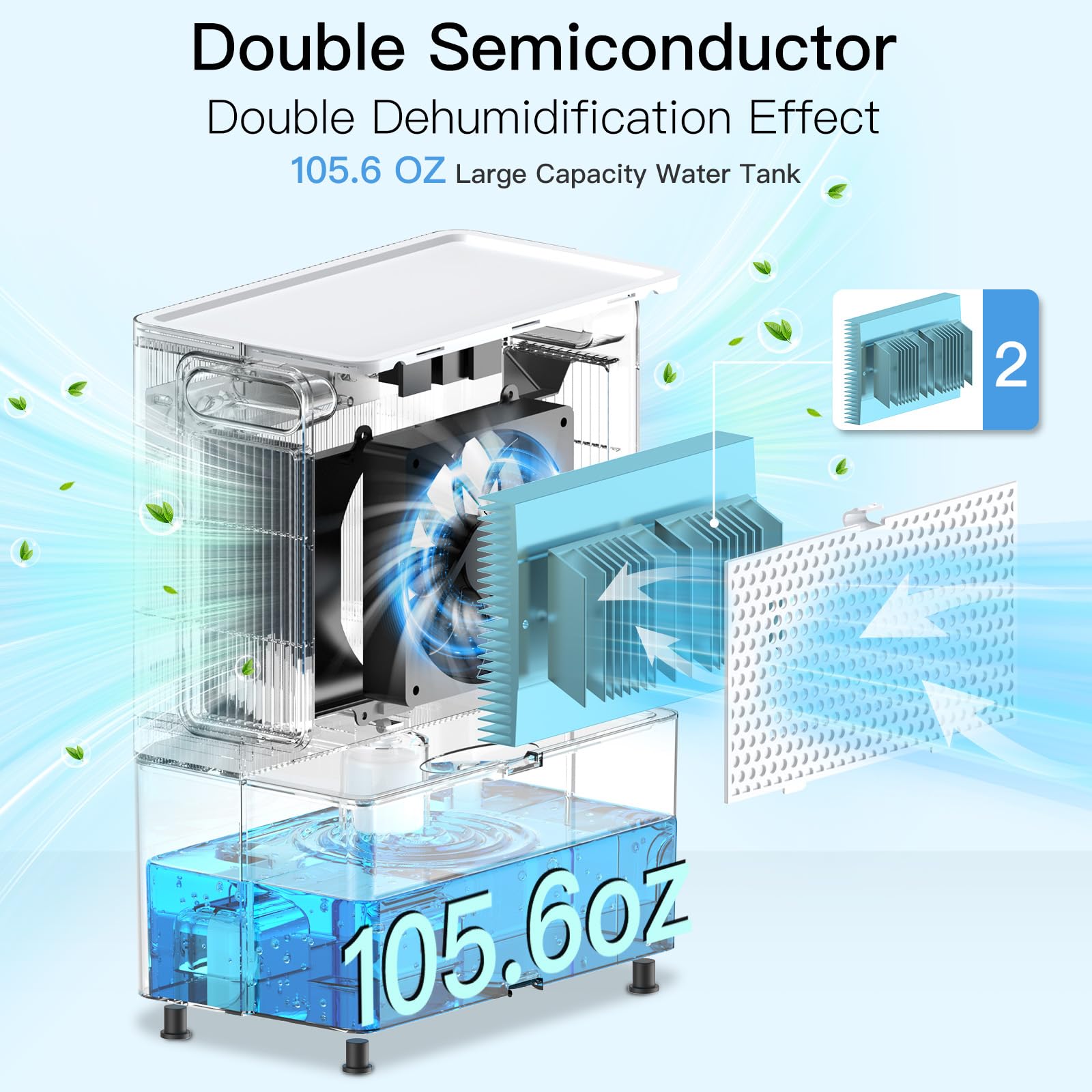 - 2024 Upgrade High Efficient Dehumidifiers: Upgrade dehumidifier utilize dual semiconductor condensation technology, ensuring quiet operation while effectively extracting moisture from the air. Can cover an area up to 950sq ft, it effectively absorb up to 1000ml excess moisture per day, maintaining optimal humidity levels below 45% to create a cozy and comfortable atmosphere in your living space