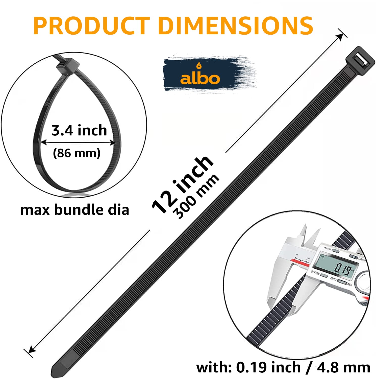 - Optimal Size: Black 12 inch zip ties (300mm), 0.19 inches (4.8mm) in width, offer a robust solution for household fixes, handling up to 50 lb in tensile strength. Max bundle diameter: 3.4 inches (86mm).