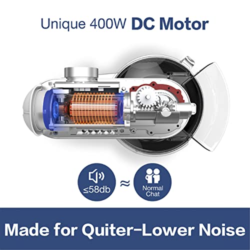 - 400W DC Motor - Powerful & Lower Noise : The 400Watt DC motor with stronger power,lower noise and energy saving.And with gears drive keeps running smooth,let the dough mixer has enough power to do heavy dough or mixtures.Made for quiter - lower noise.You can use it even your baby is sleeping.