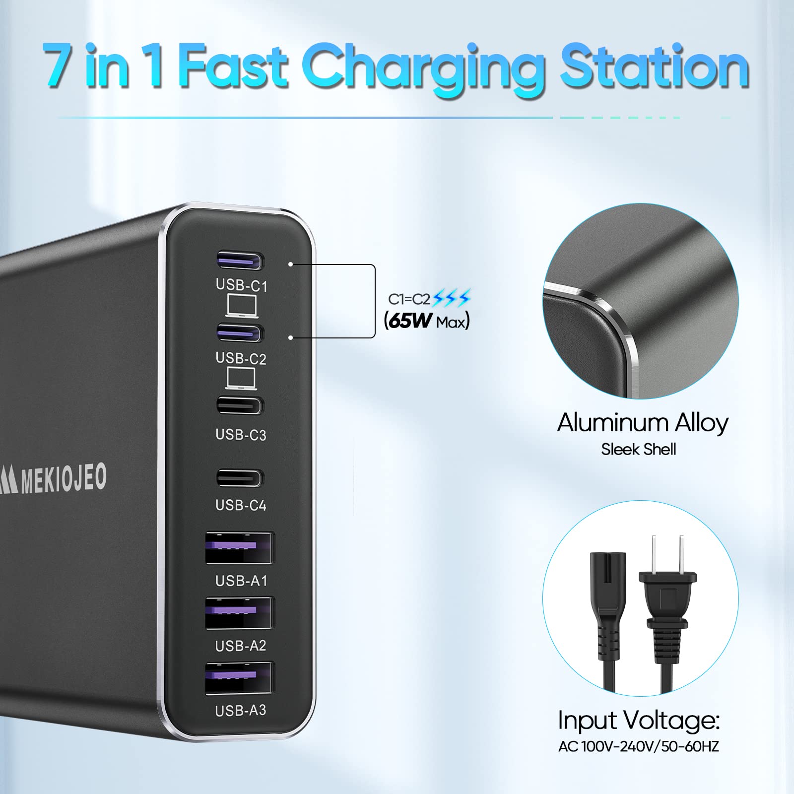 - Sleek USB C Charger: MEKIOJEO usb c charging station is finished with anti-slip aviation aluminum alloy shell, so even you plug in multiple devices it can stand on the desktop, dresser and nightstand. It won't move or flip easily than those of cheap plastic outer shell. No more hunting for outlets or lugging around a bunch of chargers when travel, much simplify your life.