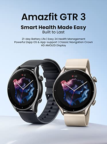 - 【21 DAYS LONG-LASTING BATTERY LIFE】The Amazfit GTR 3 activity tracker brings a kind of power and performance that's going to stay with you for a long, long time. Even with the vast array of advanced functions assembled within its slim and light body, the GTR 3 smart watch maintains a refined elegance only found in classic round watches, and yet still finds a way to integrate a powerful battery which can last for upto 21 days.
