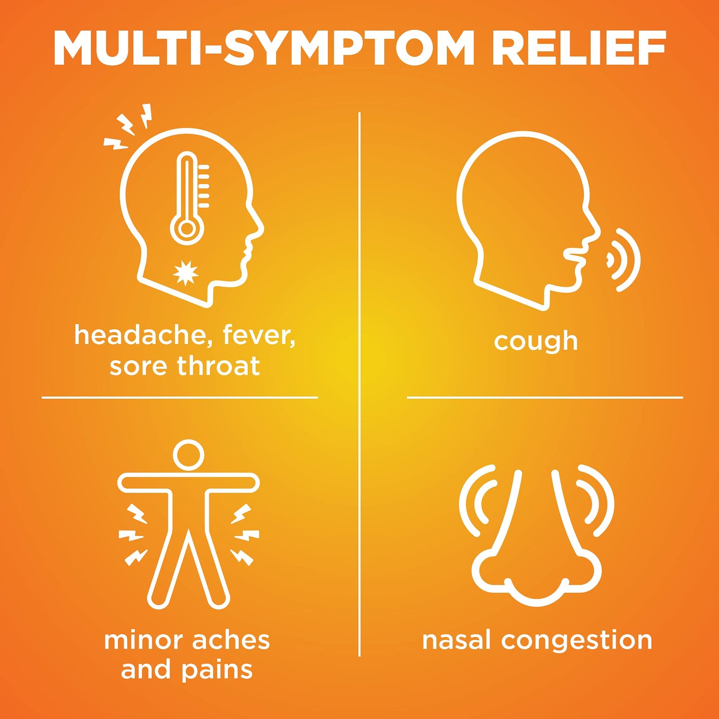 - MULTI-SYMPTOM RELIEF: This cold remedy temporarily relieves headache, fever, sore throat, minor aches and pains, nasal congestion and cough due to the common cold and flu