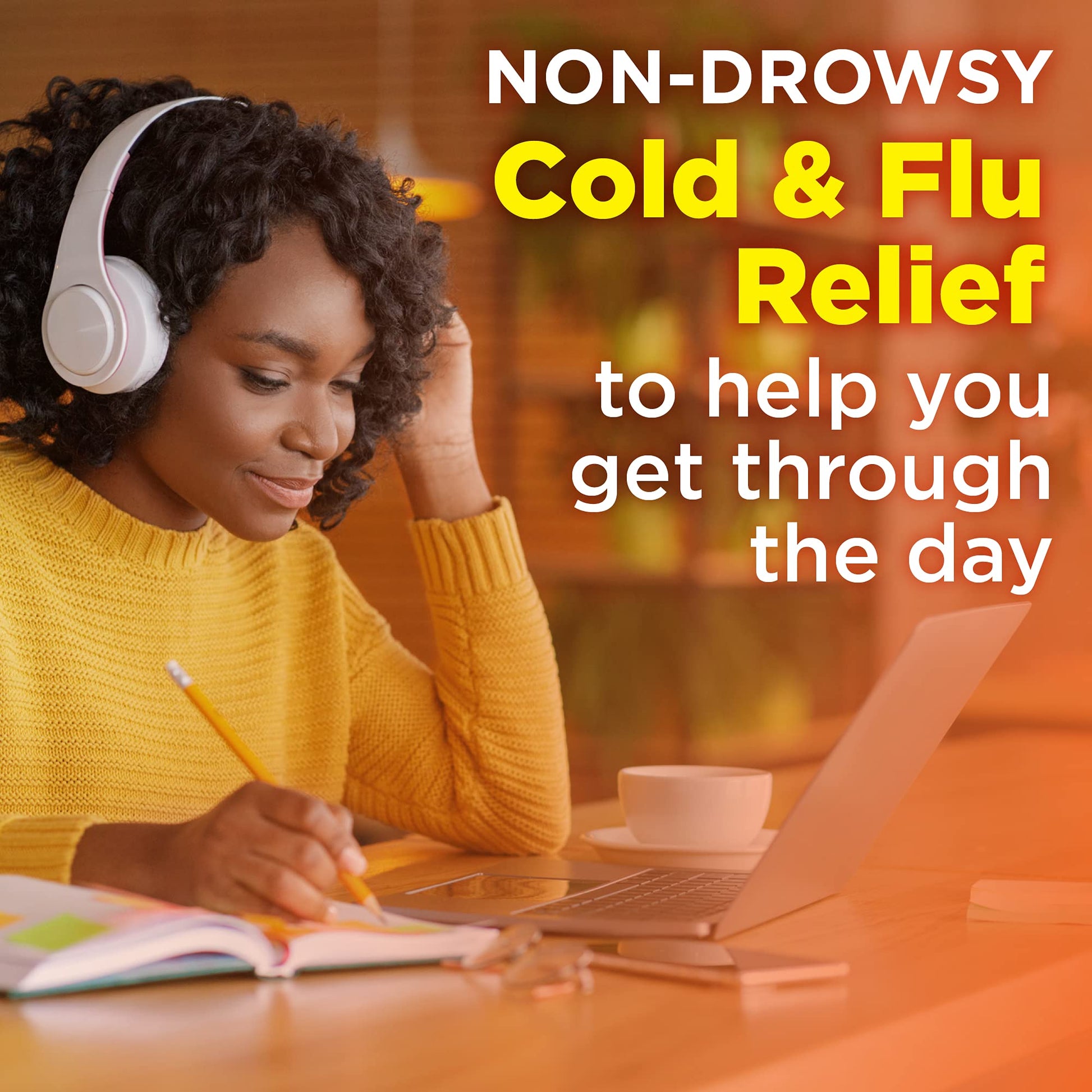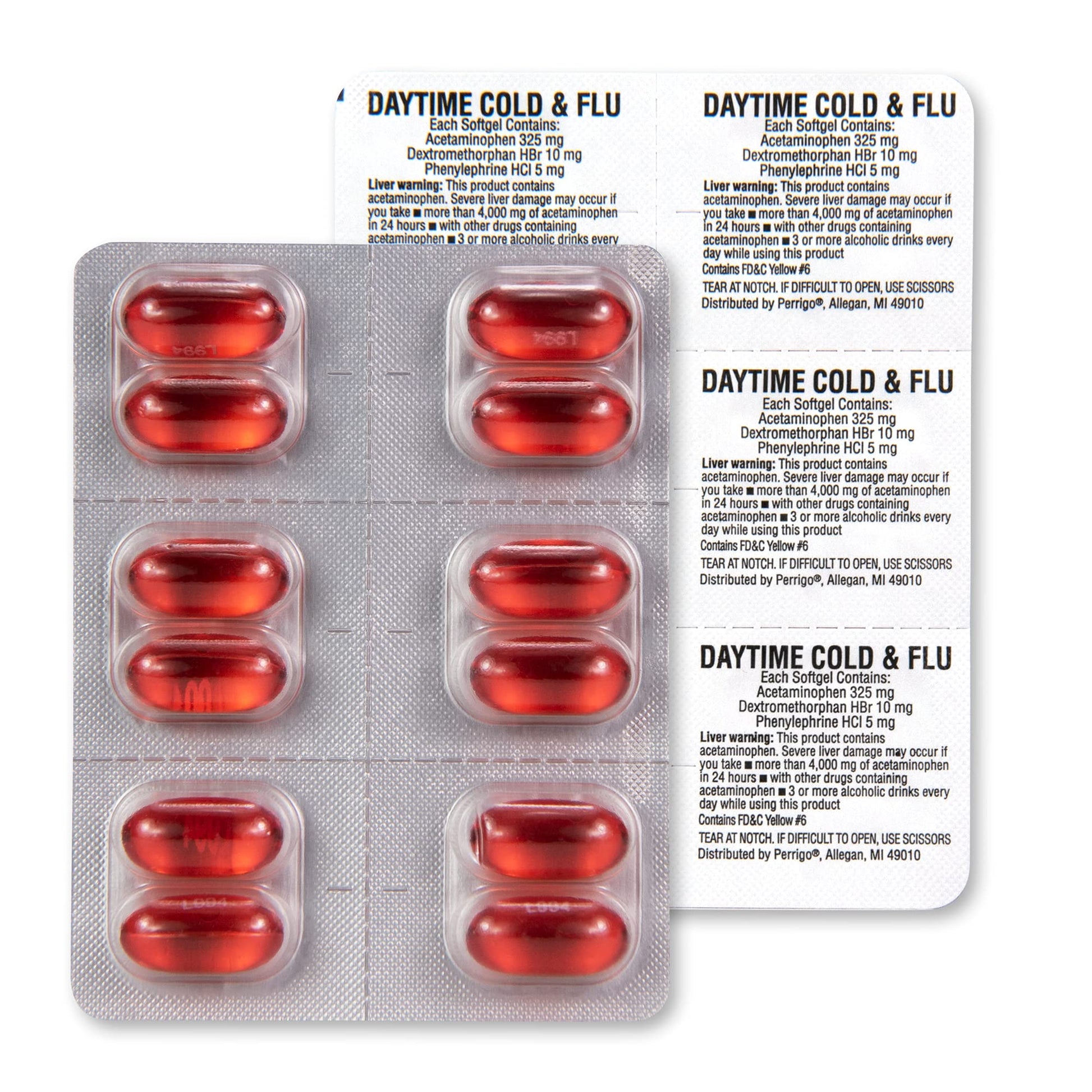 Details: Compare to the active ingredients in Vicks DayQuil Cold & Flu LiquiCaps. Amazon Basic Care Daytime Cold & Flu Liquid Caps provide powerful non-drowsy relief of major cold and flu symptoms so you can get through the day. This cold and flu medicine temporarily relieves headache, fever, sore throat, minor aches and pains, nasal congestion and cough. Gluten, alcohol and antihistamine free.
