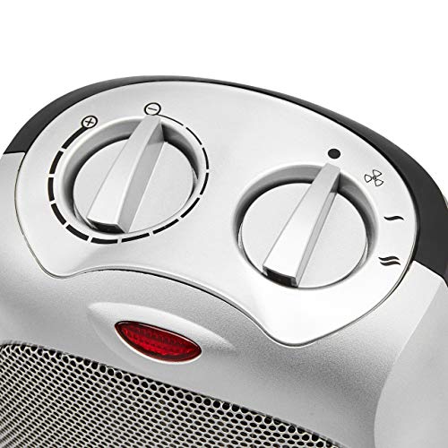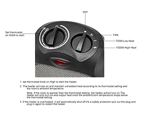 - 3 settings: Low (750 watts), High (1500 watts), and Fan Only for air circulation without heat