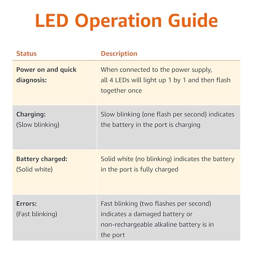 - LED Light Indicator: 1) Battery is charging: LED blinks slow. 2) Battery is fully charged: LED is solid white. 3) The charger detects an error (defective battery or alkaline battery): LED blinks fast. 4) Every time the charger is connected to power all LEDs power up and power off in a quick sequence.