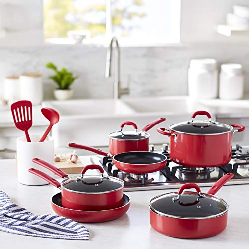 Amazon Basics Ceramic Non-Stick 12-Piece Cookware Set, Red - Pots, Pans and Utensils
