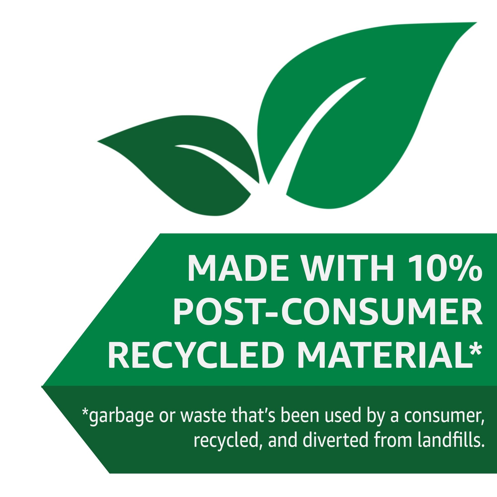 - Made with 10% post-consumer recycled material; from garbage or waste that's been used by a consumer, disposed of, and diverted from landfills