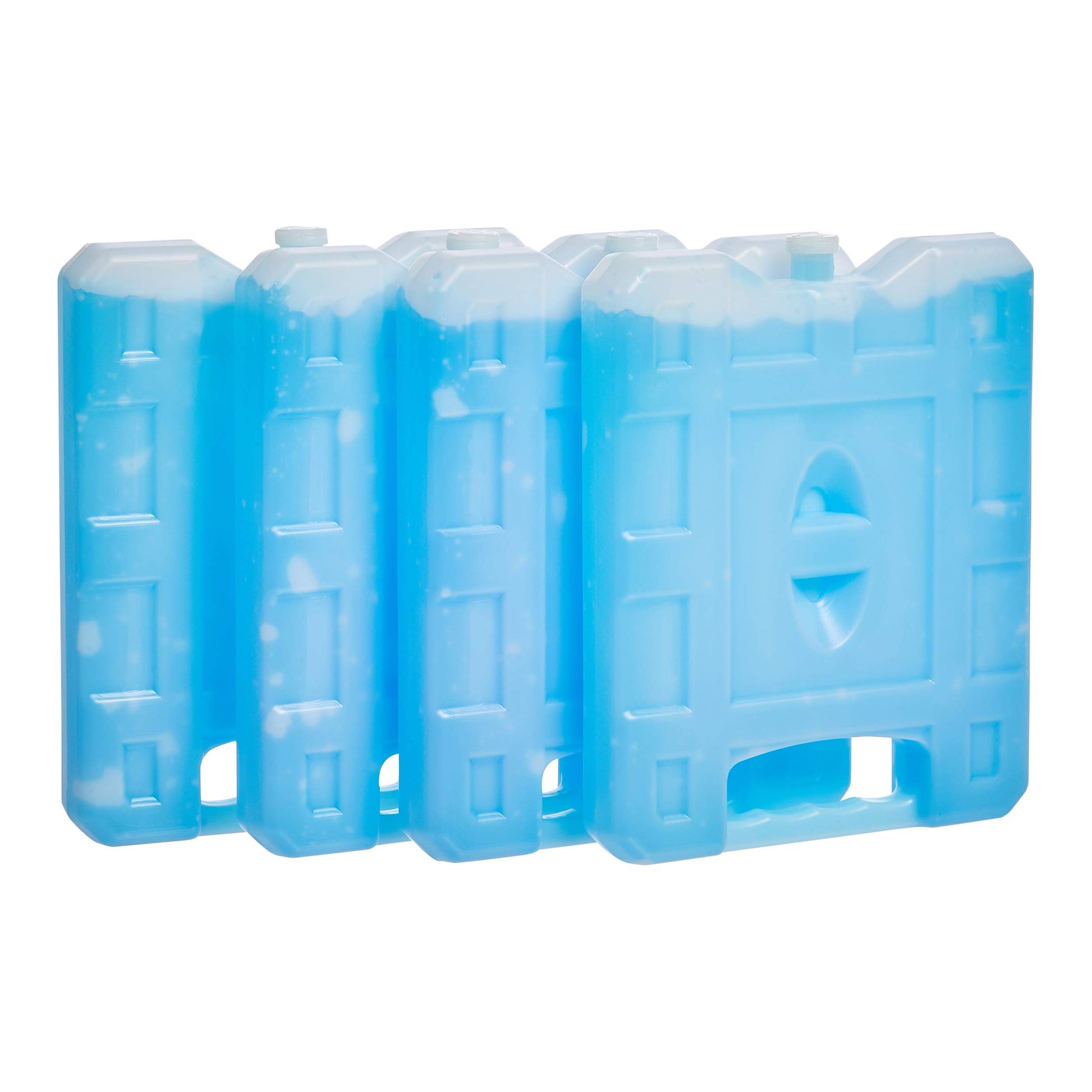 - 4-pack of hard-sided rectangular ice packs for temporary cold storage of food, beverages, perishables, and more; dimensions measure 8.3 x 6.7 x 1.2 inches
