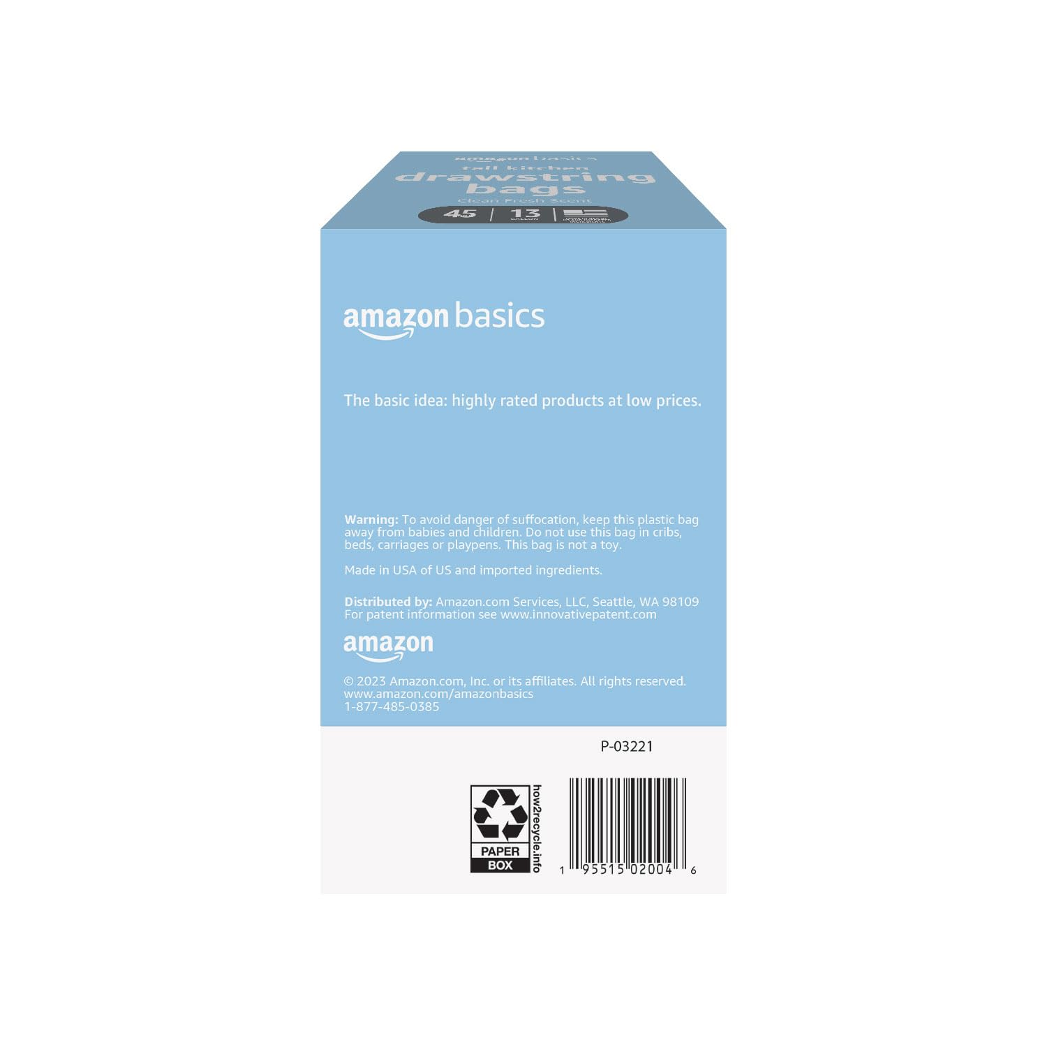Details: These tall kitchen trash bags come in a pack of 45, with each bag offering a sturdy 13-gallon capacity. Measuring 24 inches wide by 27 3/8 inches tall, these trash bags for the kitchen feature a 0.9 mil thickness, meaning they are both robust and reliable for your daily needs. The 13-gallon tall kitchen garbage bags design makes them ideal for large kitchen trash disposals. With a clean fresh scent, they help to keep unpleasant odors at bay. The red drawstring closure on these tall kitchen bags 13-gallon drawstring variety provides effortless tying and easy lifting for disposal. Opt for Amazon Basics for practical and reliable tall kitchen trash bags that simplify waste management. Suitable for anyone searching for trash bag kitchen essentials, these tall kitchen trash bag options consistently meet your needs.