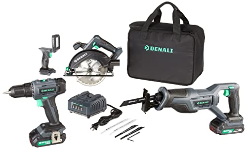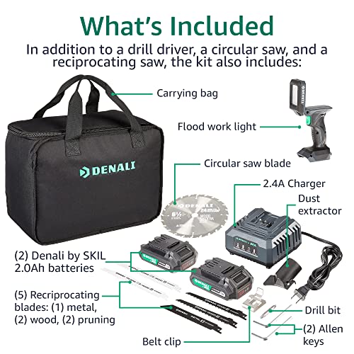 Amazon Brand - Denali by SKIL 20V Cordless Drill, Reciprocating & Circular Saw, Work Light With (2) 2.0Ah Lithium Batteries, 2.4A Charger & Carry Bag