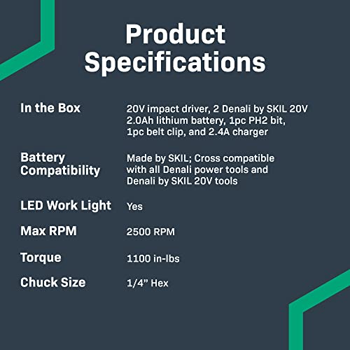 - Includes a 20V impact driver, 2 Denali by SKIL 20 2.0Ah lithium batteries, a 2.4A charger that fully charges a 2.0Ah battery in 60 minutes and a 4.0Ah battery in 100 minutes, bit, and belt clip