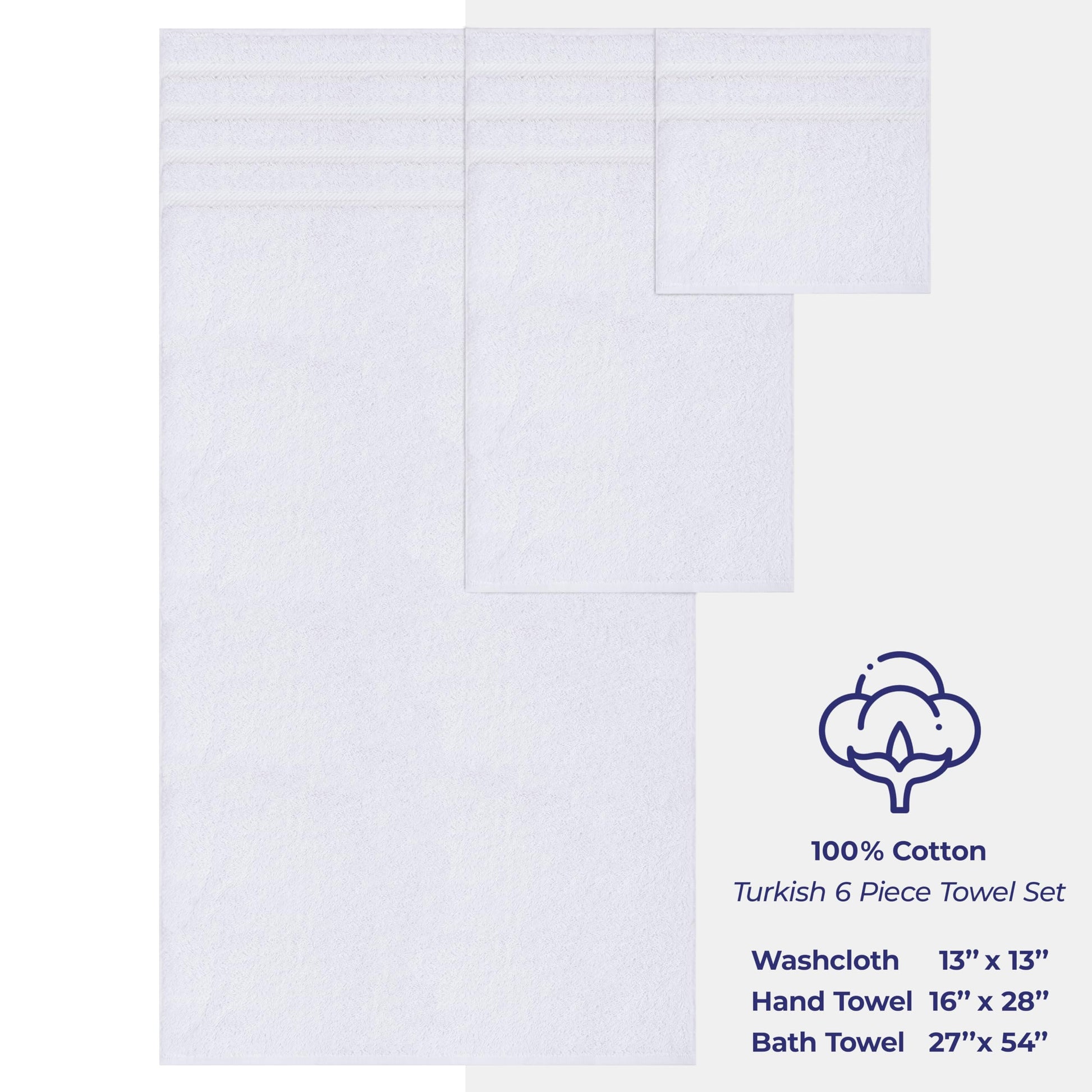 - ✅ Turkish Luxury 6 Piece Towel Set Includes 2 Bath Towels of 27 x 54 inches, 2 Hand Towels of 16 x 28 inches and 2 Washcloths of 13 x 13 inches.