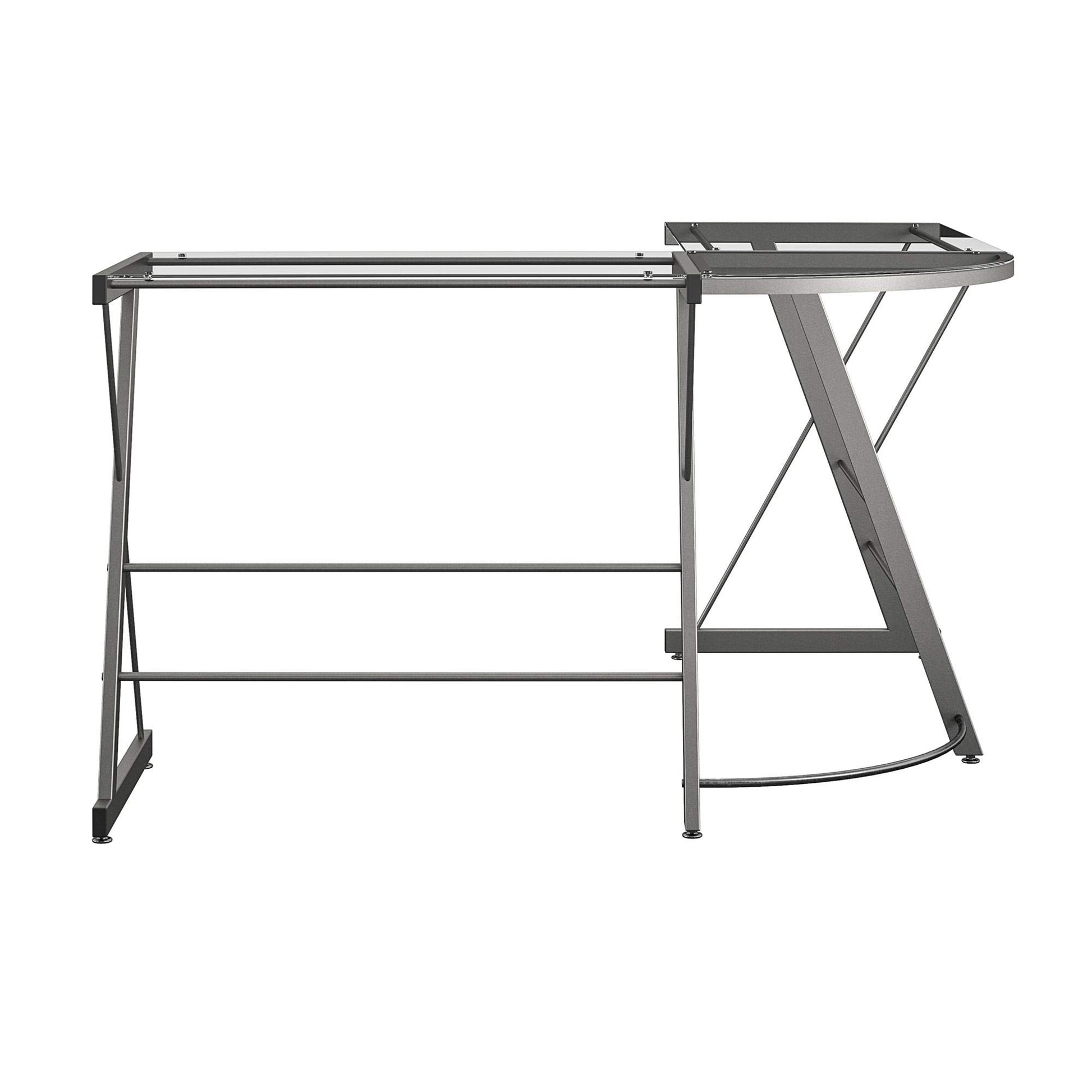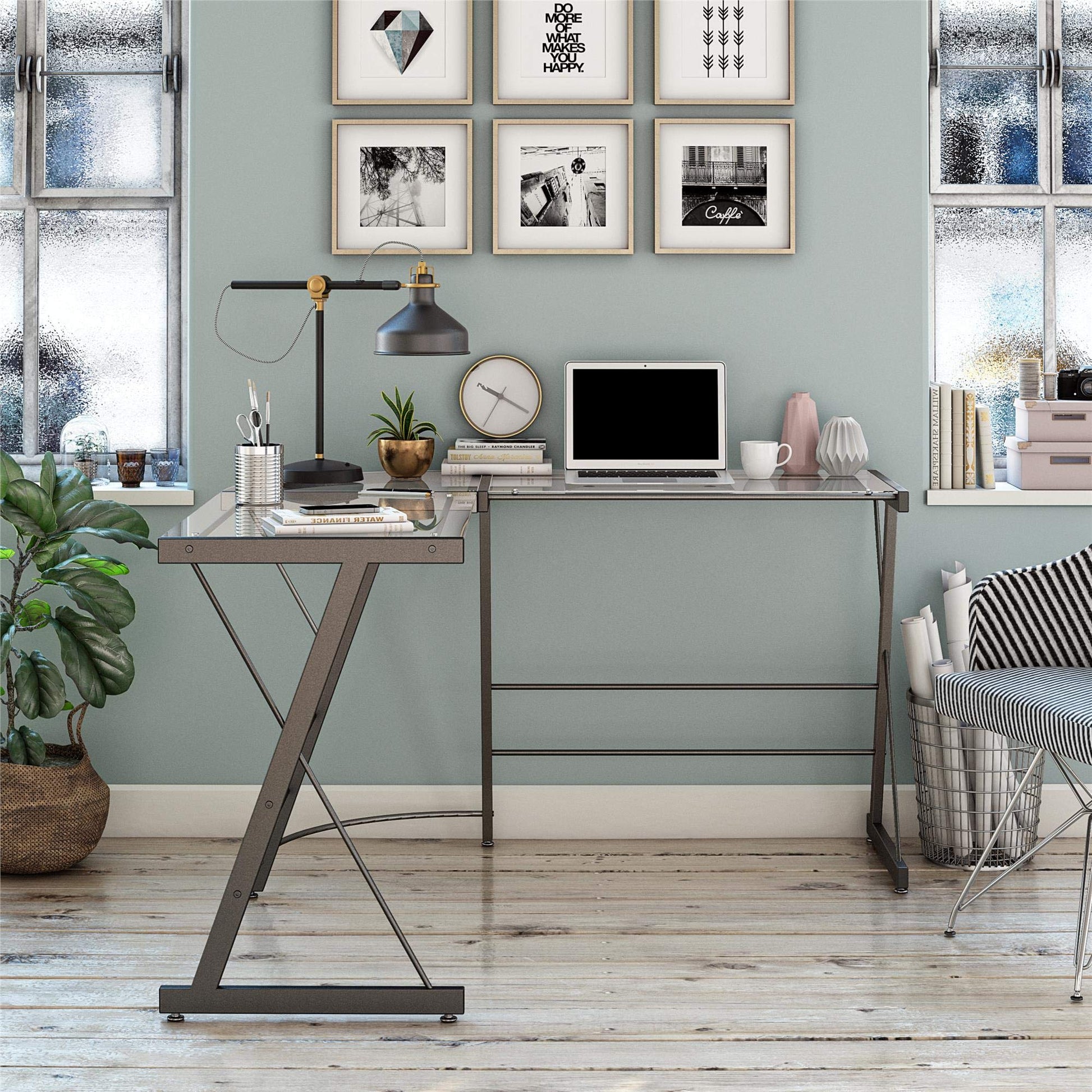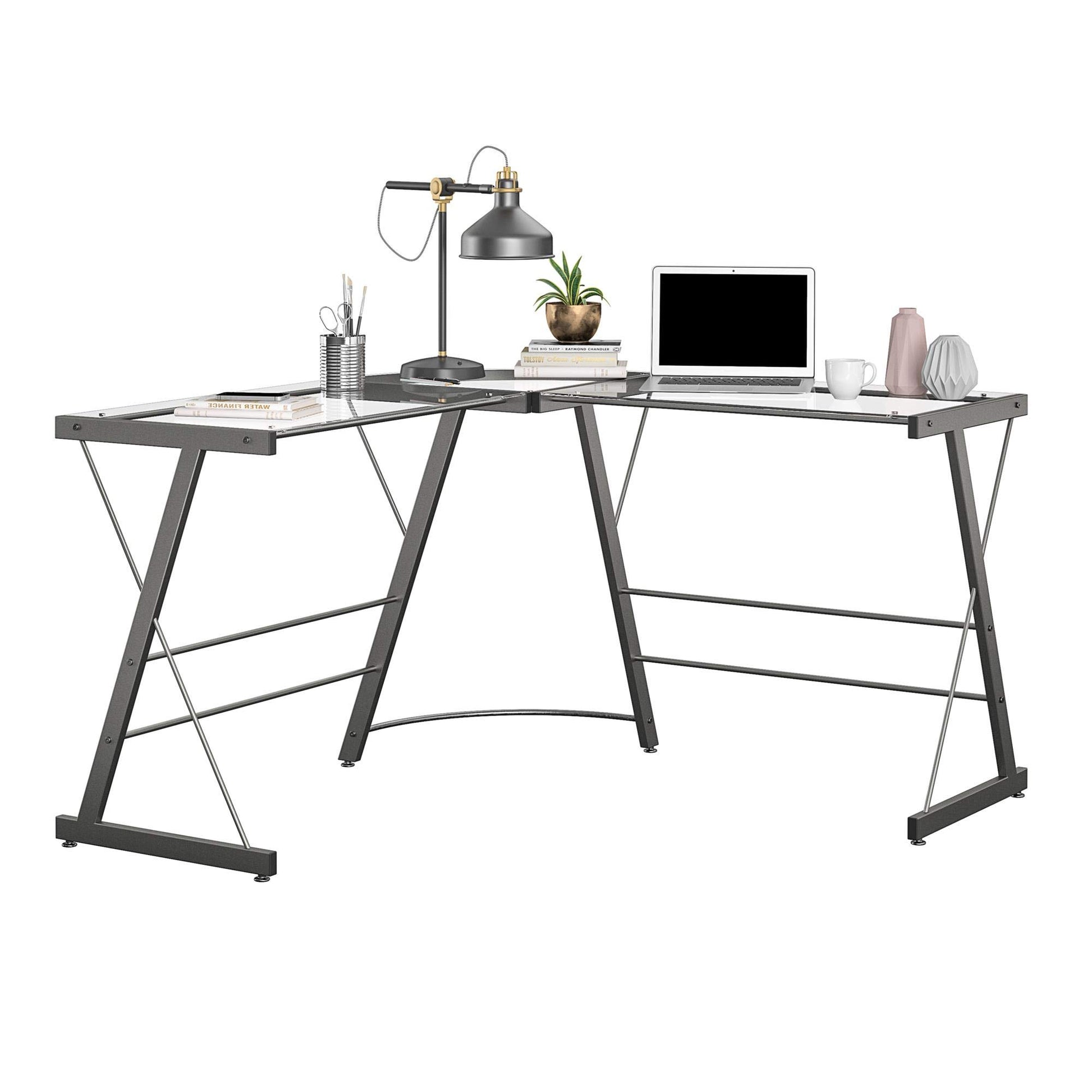 Details: The Ameriwood Home Odin Glass L-Shaped Computer Desk gives your office a contemporary feel with a modern twist. This Desk combines a sleek glass work surface with a streamlined gray metal frame that’s sure to look beautiful in any space.