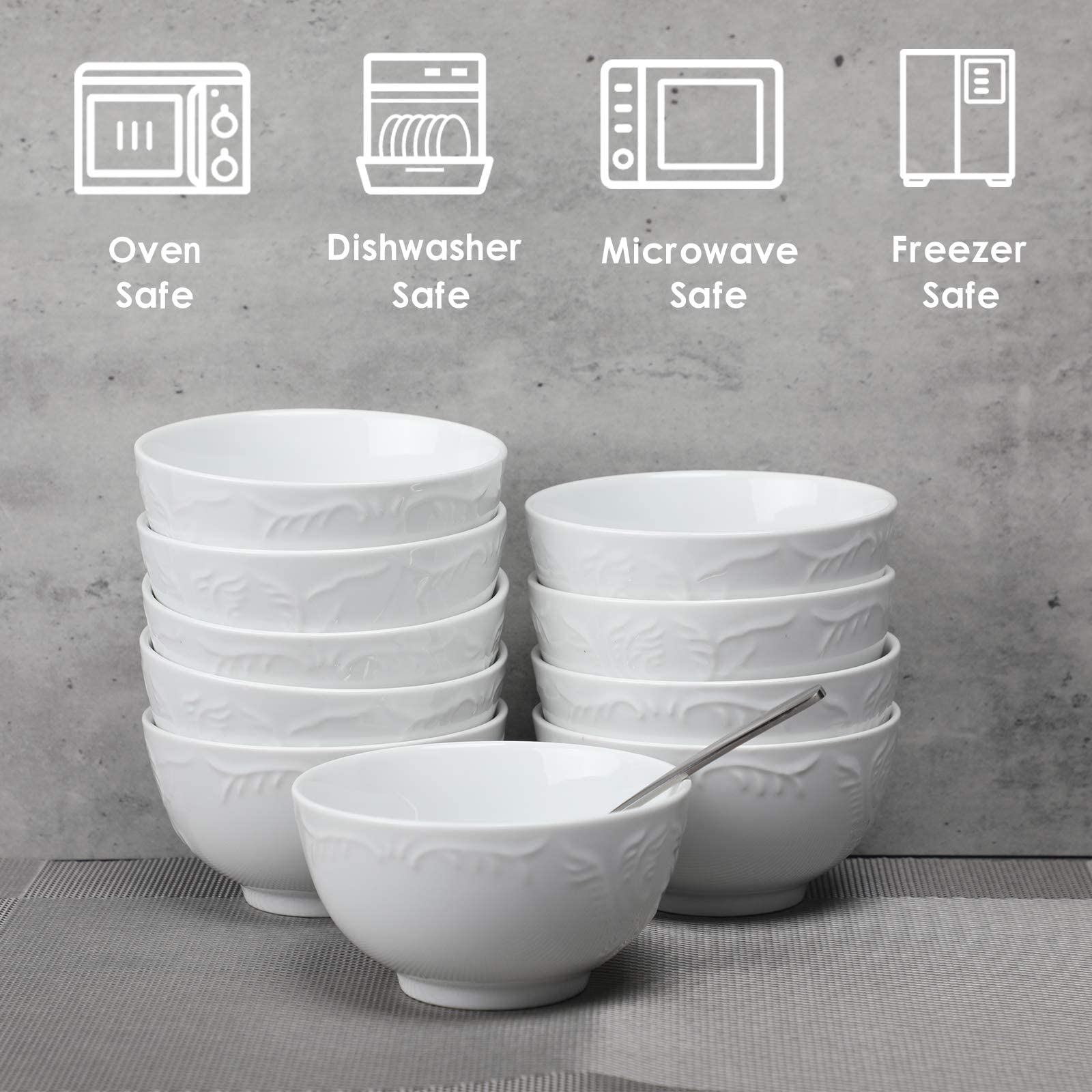 - Embossed Texture Design & Stackable. Stacks compactly and free up enough space for other dining set in the kitchen cabinet. Classic bright white bowls match most existing dinnerware. Anti-scratch glazed interior is easy to clean.