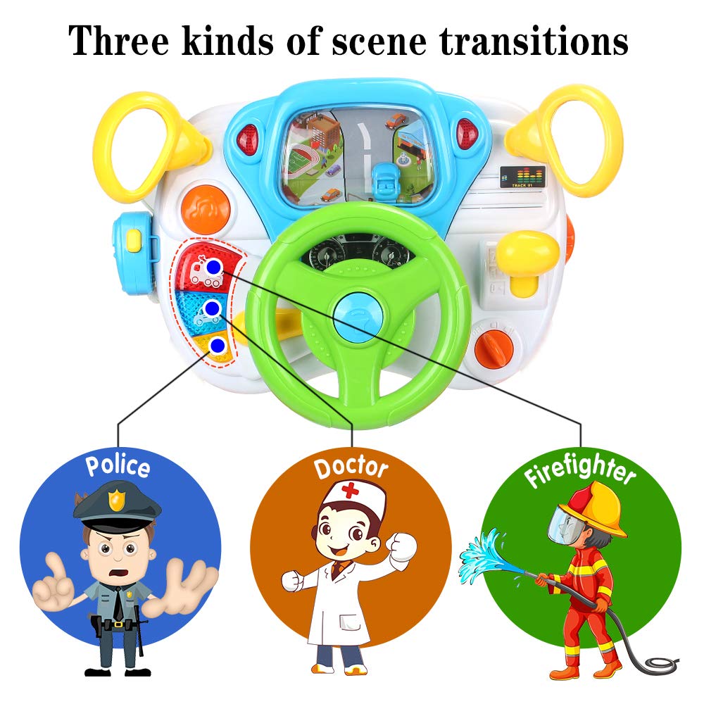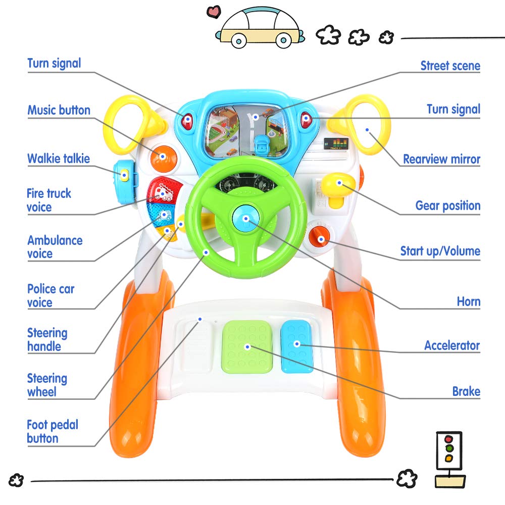 - 【Pretend Play】 Pretending to drive using the steering wheel that causes the toy car on the screen to move left and right will bring your little boy countless happy hours!