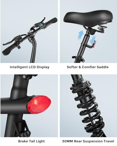 - π[Safe & Cozy Day or Night Bike Riding] ANCHEER StreetRider adult electric bicycles equipped with Dual Shock Absorbers (suspension front fork + rear shock absorption) and spring shock saddle, suitable for more terrain. Dual disc brakes provide reliable stopping power, ensuring you can stop quickly and safely. The bright headlight and an integrated taillight with brake-light indicator keep you visible to all, especially in low-light conditions or during night riding