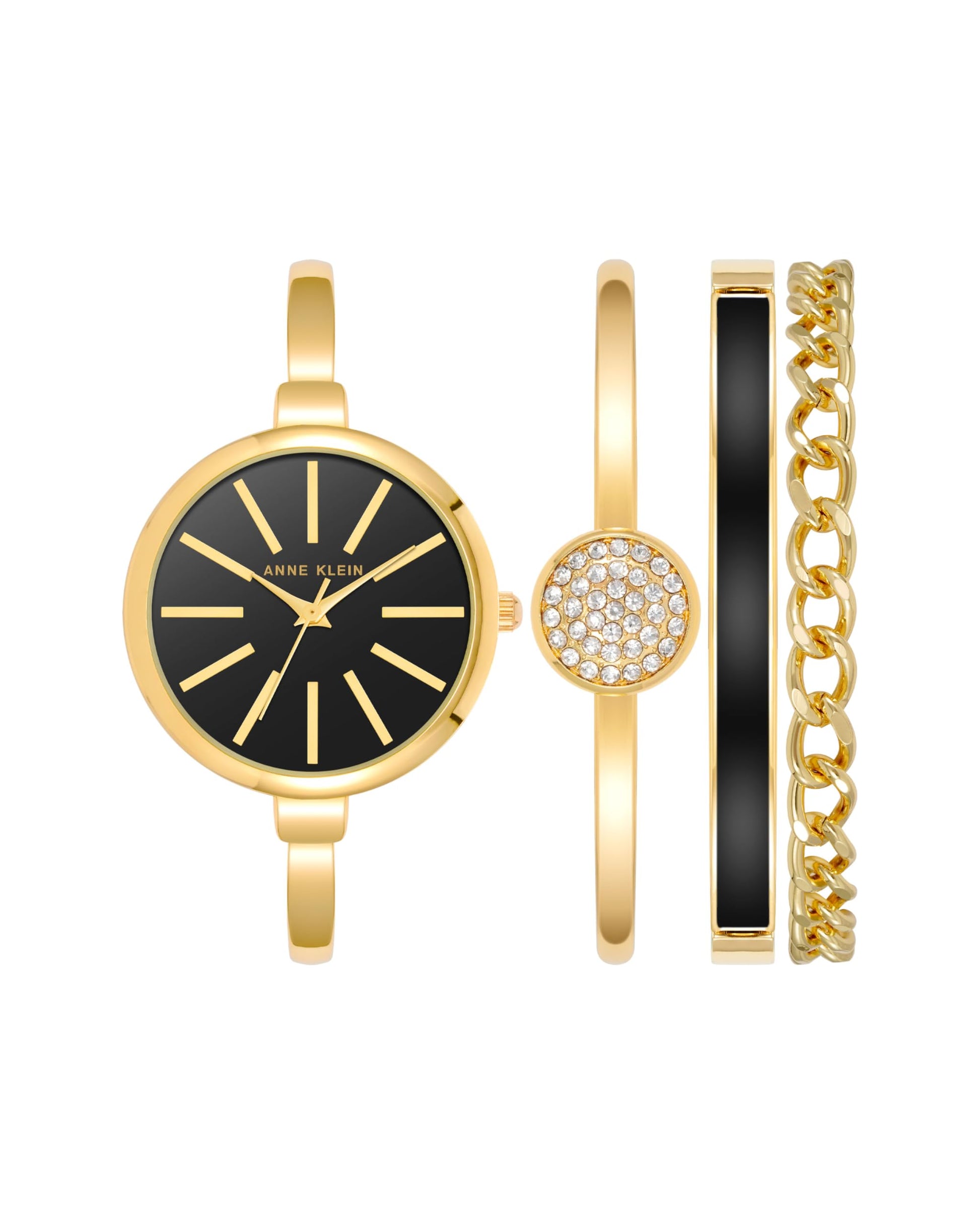 - Watch comes with bracelet set that includes 1 gold-tone bangle with black enamel filling ,1 gold-tone bangle with clear Swarovski crystal accented center piece, and 1 gold-tone chain bracelet