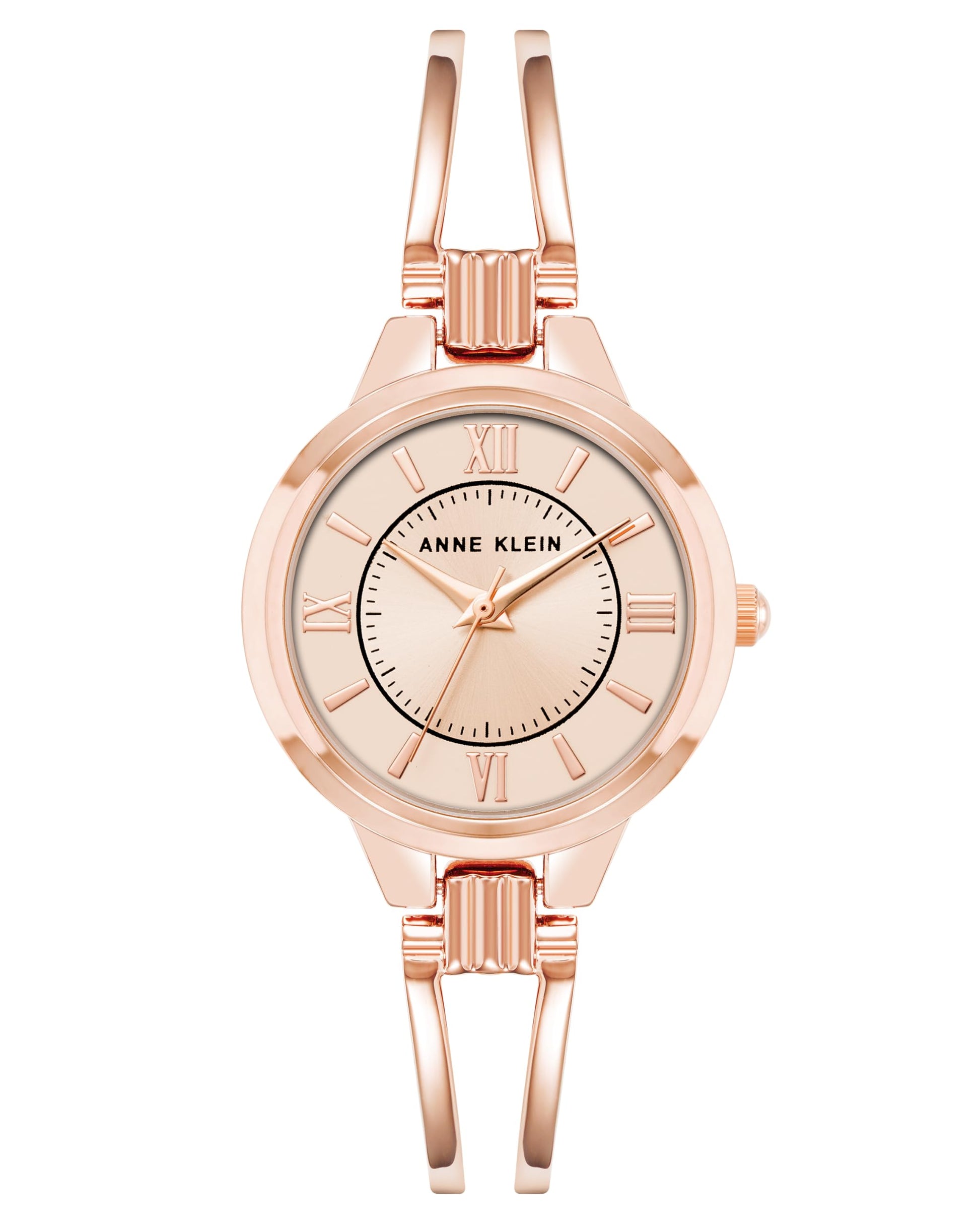 - Rose gold-tone dial with matching hands and markers; black inner minute track