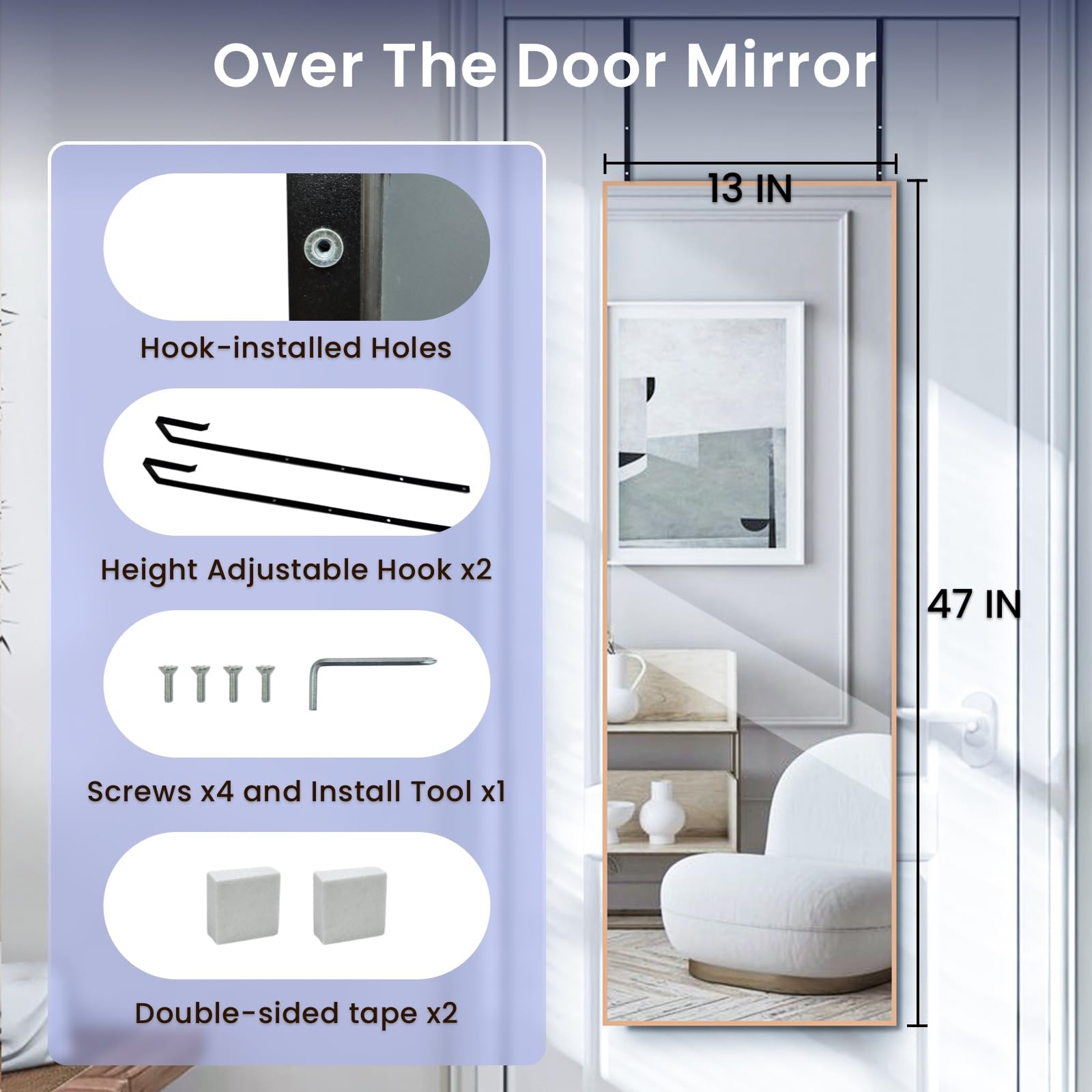 - Lightweight and Tight Packaging, A Great Gift: The over door mirror is a nice gift to your loved ones for brithday,christmas and other present giving moments. The package includes a full length mirror, instruction, hooks, screws. The door mirror is well-protected inside, ensuring safe and secure delivery. If it's found damaged on arrival, please feel free to contact us for after-service