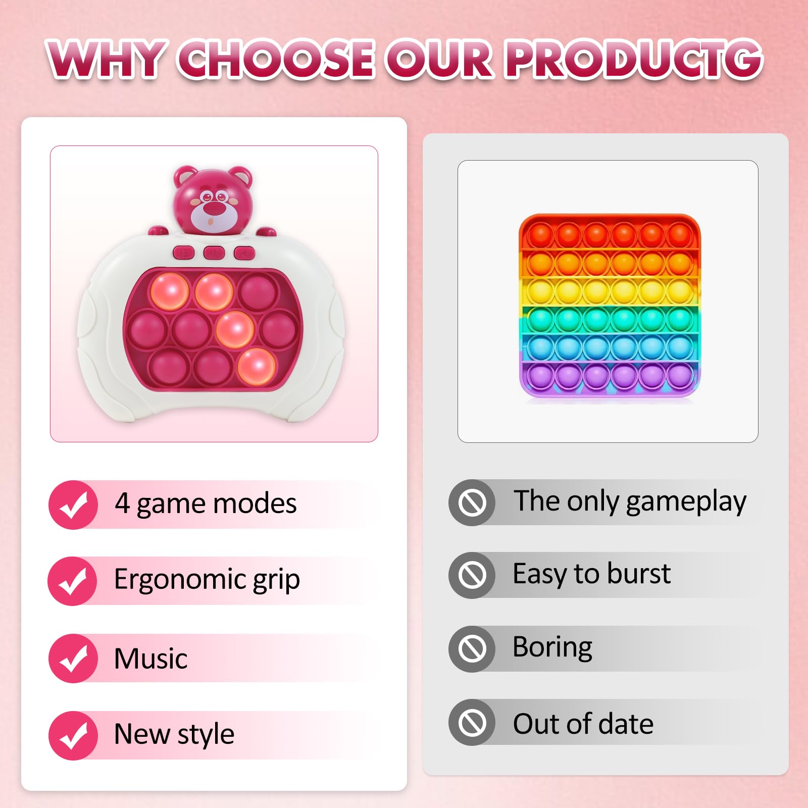 - đ ăFour exciting game modesă With four different game modes, the Pop fidget toys offers endless fun and challenges for players of all ages. Whether you're looking for a fast-paced puzzle game or a relaxing matching game, the sensory toy has something for everyone.