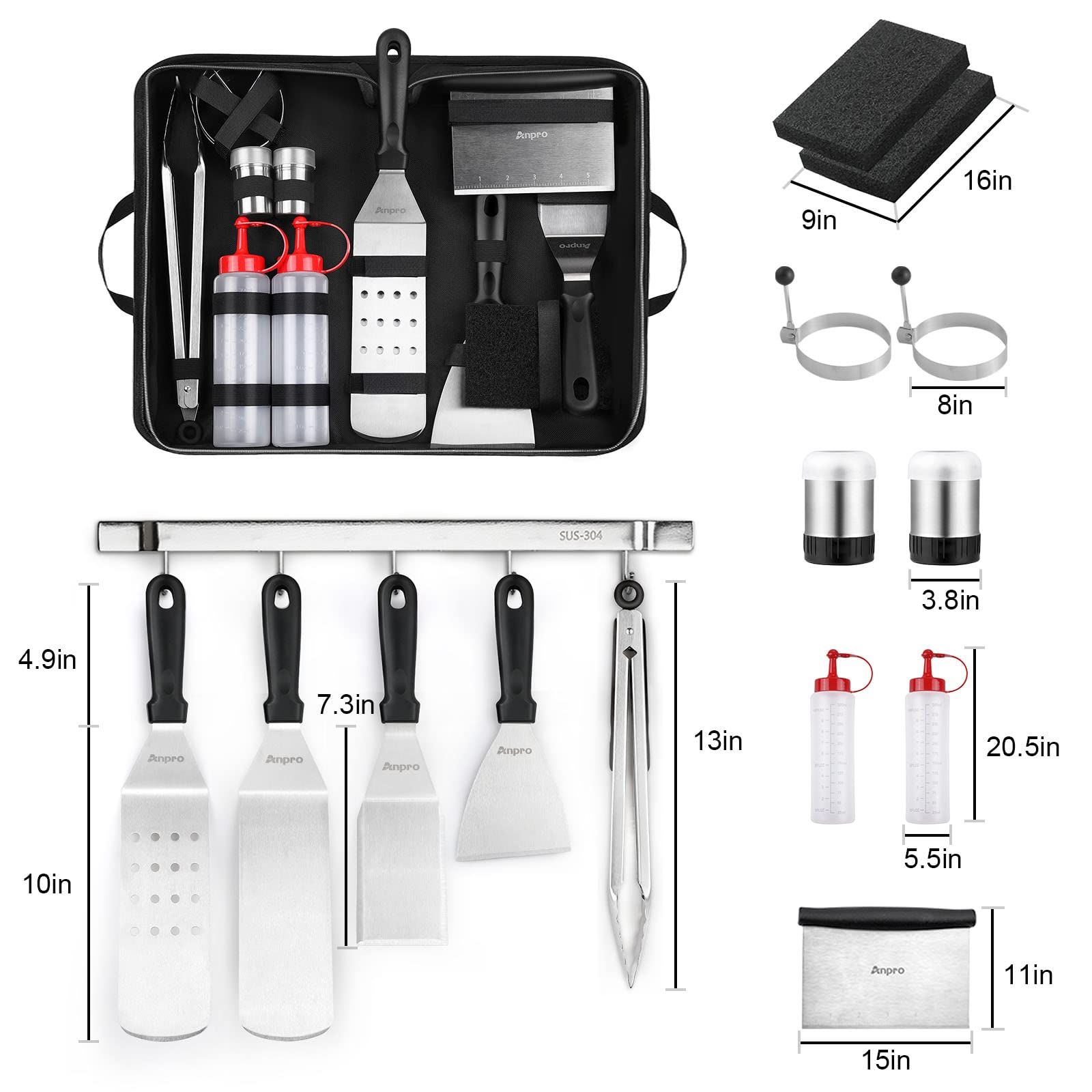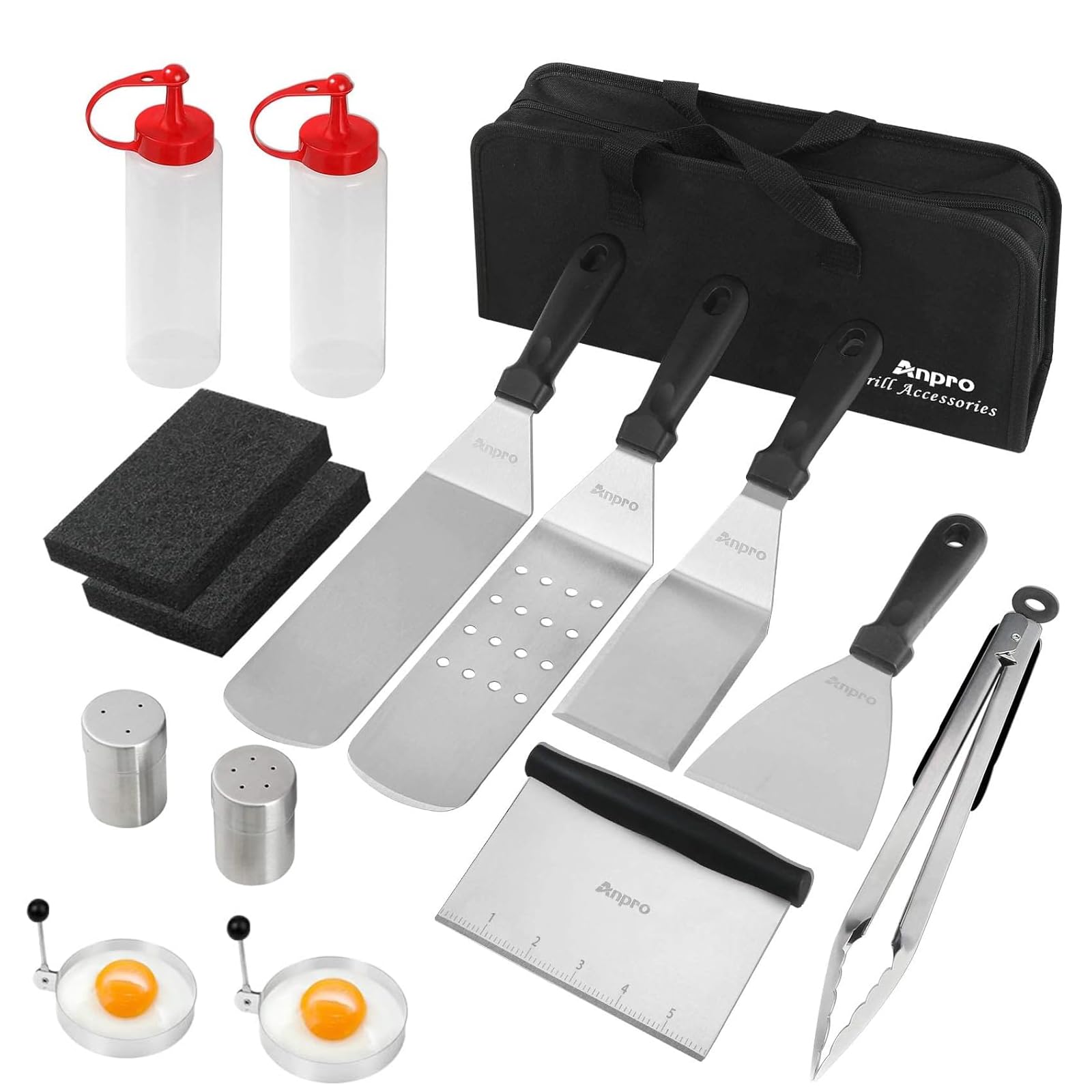 Anpro Griddle Accessories,15 Pcs Anti-Scalding Long Handle Flat Top Griddle Accessories Set for Blackstone,Stainless Steel BBQ Accessories w/Spatula, Basting Cover,Tongs,Egg Mold & Carry Bag