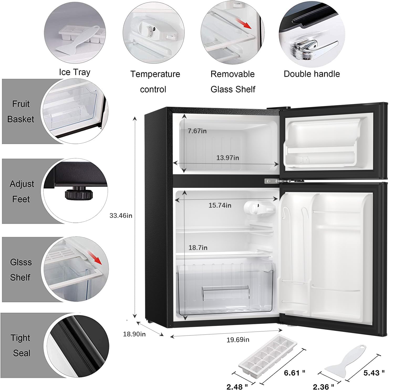 - Size and Capacity-Dimension is 19.69''(D)×18.9''(W)×33.46''(H) and 3.2cu.ft capacity. Sufficient space to store your eggs, vegetables, drinks,fruits and milk. This fridge is also equipped with ice cube tray and Ice shovel.