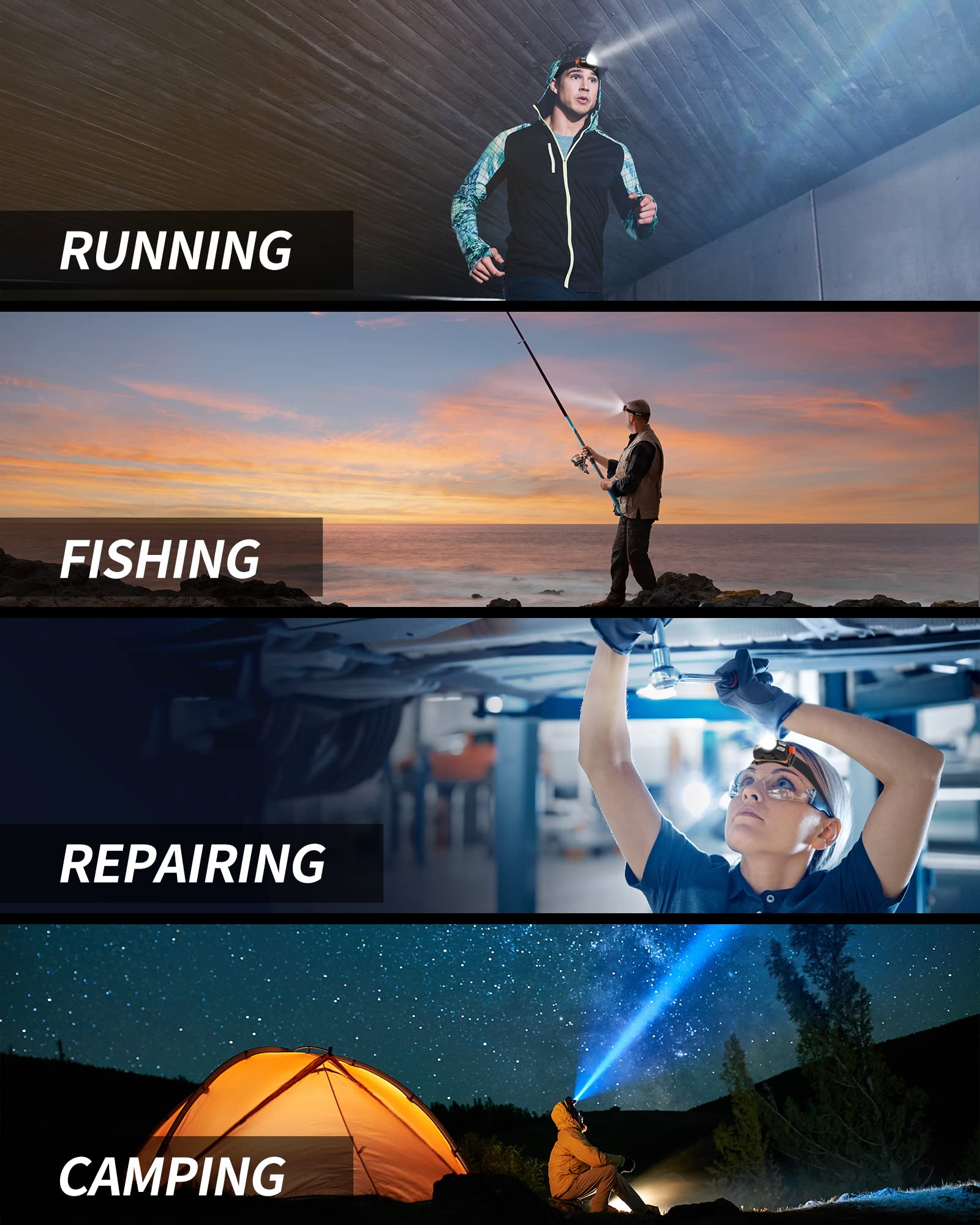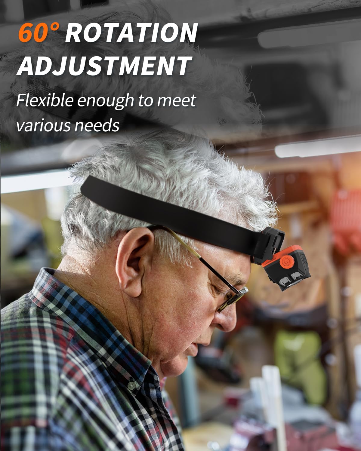 - 【Adaptable and Versatile】Its adjustable head angle of 60 degrees lets you customize the light direction according to your needs. It ensures that you can use this headlamp comfortably, whether you're hiking, camping, reparing or working on a DIY project.
