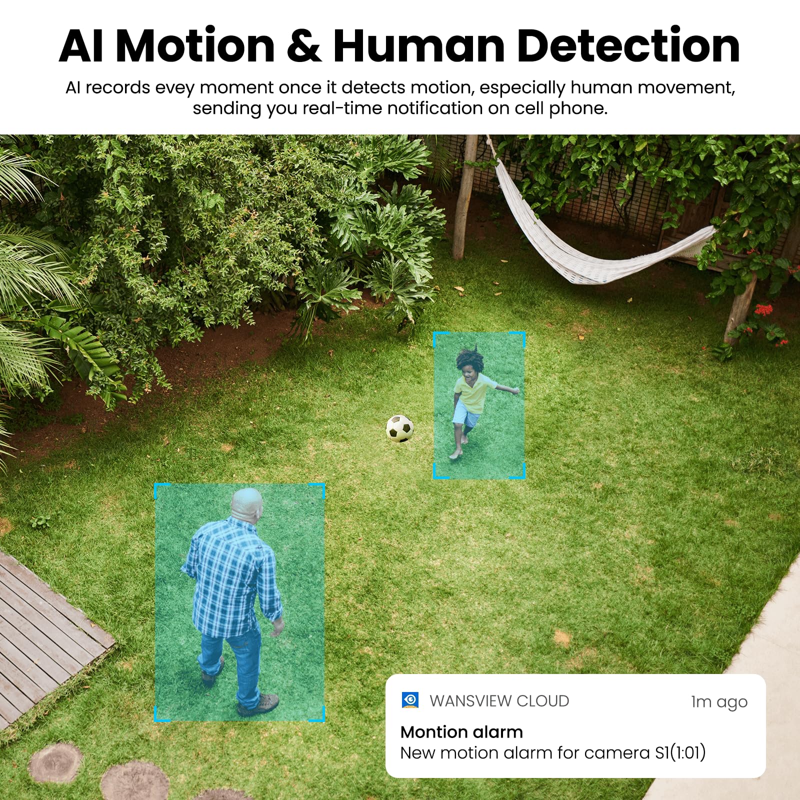 - AI Human Detection Siren & Intelligent Spotlight: The wireless security camera outdoor with PIR motion sensor and automatic spotlight provide you and your family a full-protection on your safety and property. When the wireless camera outdoor detects unexpected visitors approaching your house, it will trigger an audible alarm and automatically turn on the night spotlight to scare the intruders and send you instant notifications, so you can maintain a peace of mind even when you're not at home.