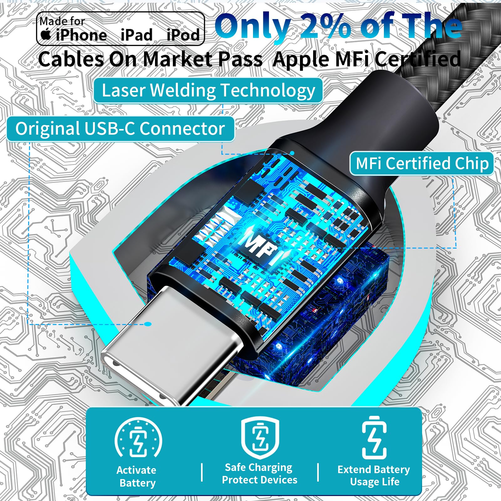 - 【MFi Certified Type-C to Type-C Braided Cable】: Original USB-C Connector and Embedded E-Marker Chip adjust voltage output to match iPhone 16. MFi Certified Chip full compatibility with iPhone 16/16 Plus/16 Pro/16 Pro Max/15/15 Plus/15 Pro/15 Pro Max, iPad Pro 12.9 inch, iPad Pro 11 inch, iPad Air 5th/4th, iPad 10th, iPad Mini 6. Also compatible with Galaxy, Pixel. The MFi Certified USB-C Braided Cable provide overvoltage protection, battery protector and automatic chip recognition function.