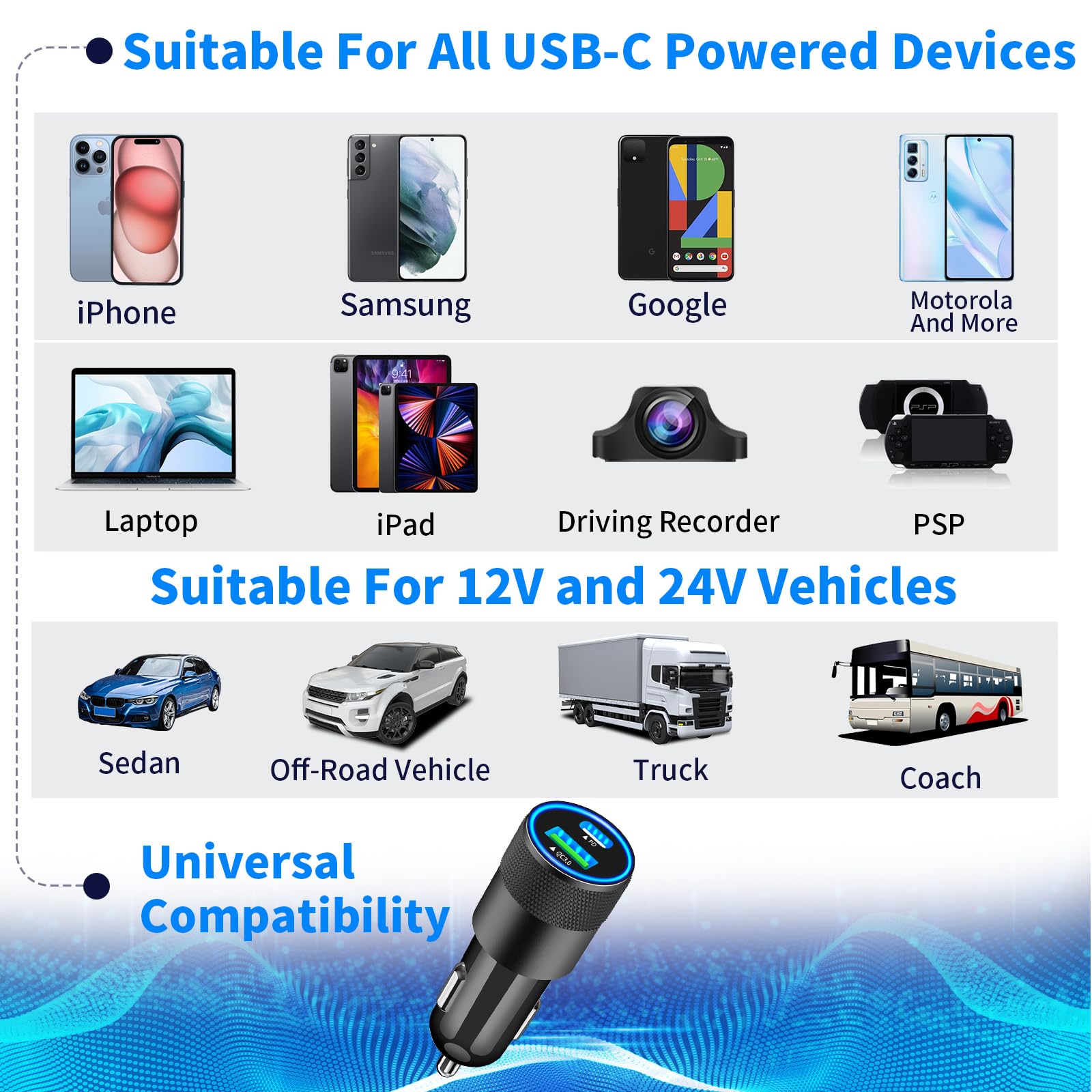 - 【Premium Materials and Design】: The housing made of an aluminum alloy + ABS fireproof materials offers better scratch resistance, heat dissipation, attractive design, and long service life, suitable for the most untouched vehicle interiors. Gold-plated tubing reduces heat during charging while maximizing charging speed and efficiency. The ring LED blue indicator can help you to find the charging ports easily in the dark, Easily fits in a car Cigarette Lighter socket with limited space.