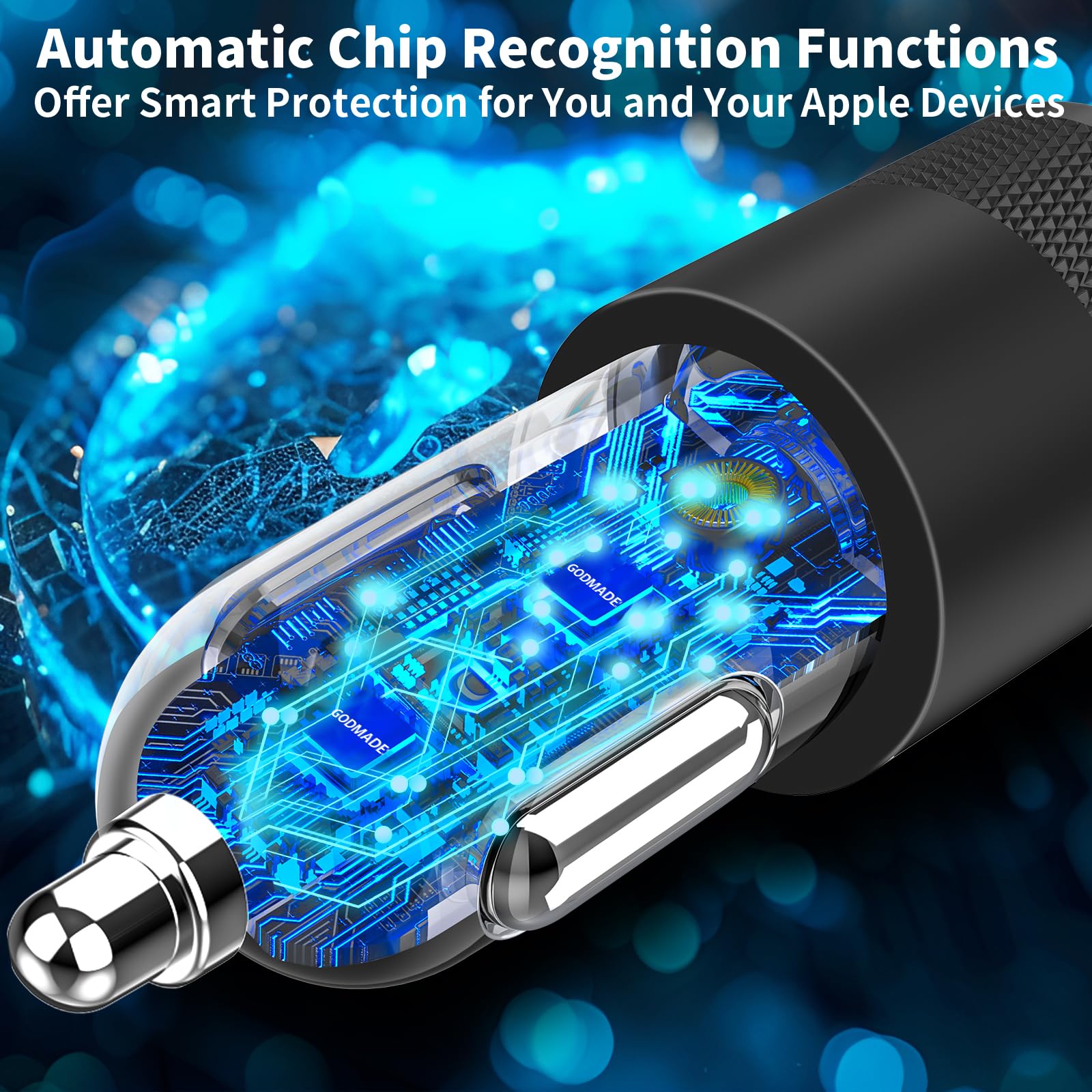- 【Premium Materials and Design】: Sturdy polycarbonate shell + PC flame retardant V-0 grade design keep the car adapter going against over-load and over-charge, Gold-plated tubing reduces heat during charging while maximizing charging speed. The shrapnel contact design makes the car charger plug-in firmly to provides a stable connection for the iPhone. The ring indicator LED light can help you to find the charging ports in the dark, Easily fits in a car cigarette Lighter socket with limited space.