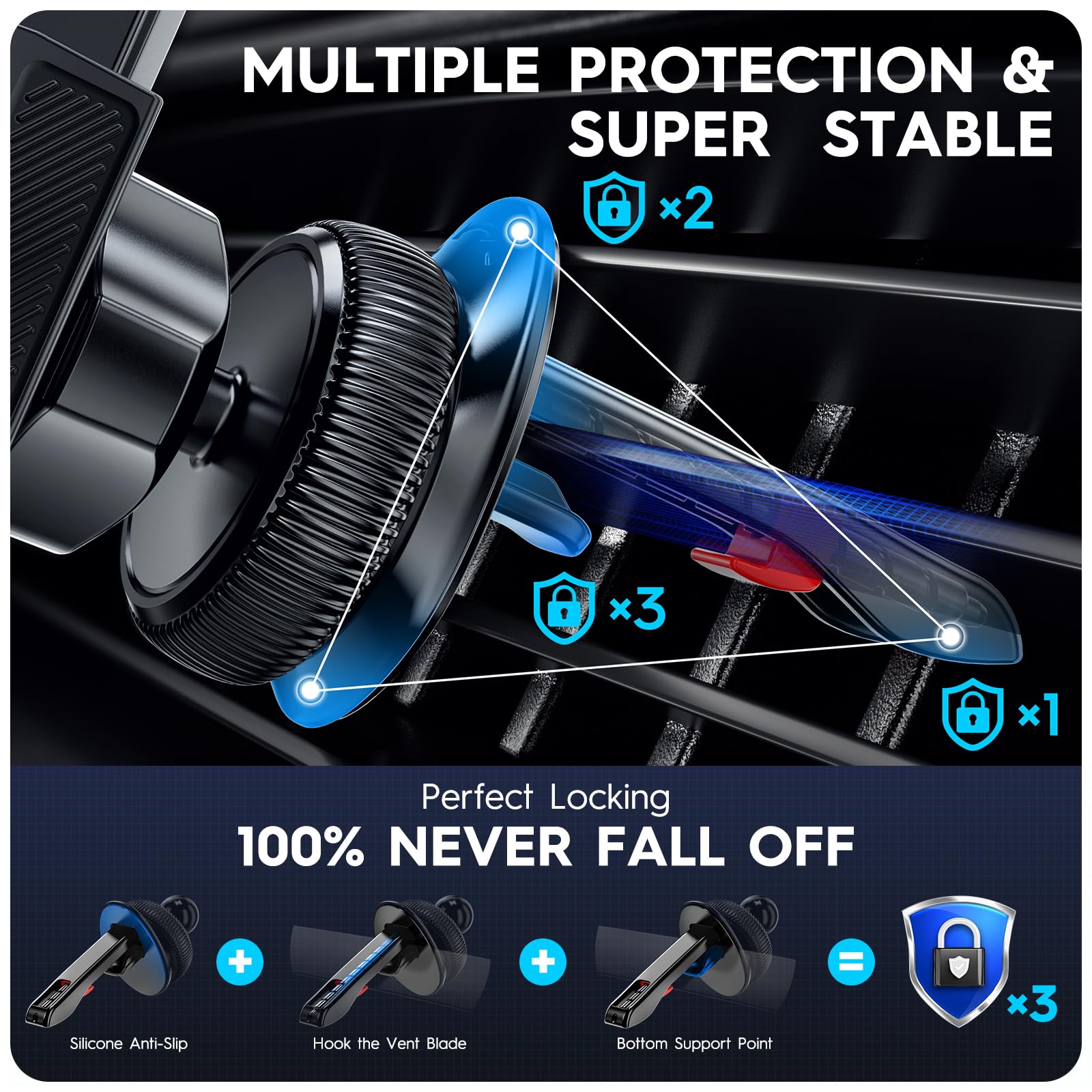 - 【Screw Air Vent Tightly】The car phone mount adopts an innovative locking protection mechanism, which firmly locks the blades of the air vent without scratches. The iPhone car mount is compatible with horizontal and vertical air outlets, ensuring excellent stability even on sharp turns or bumpy roads.