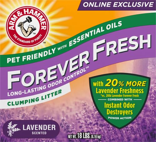 - ONLINE EXCLUSIVE! Fill your cat litter box with the refreshing scent of fresh lavender fields with ARM & HAMMER Forever Fresh Lavender Clumping Cat Litter! This effective, odor-controlling 18 lb. size cat litter is only available online—ready to be shipped directly to you anytime you need it. Its convenient, new 18 lb. size also delivers 20% more lavender freshness than our 20 lb. size!