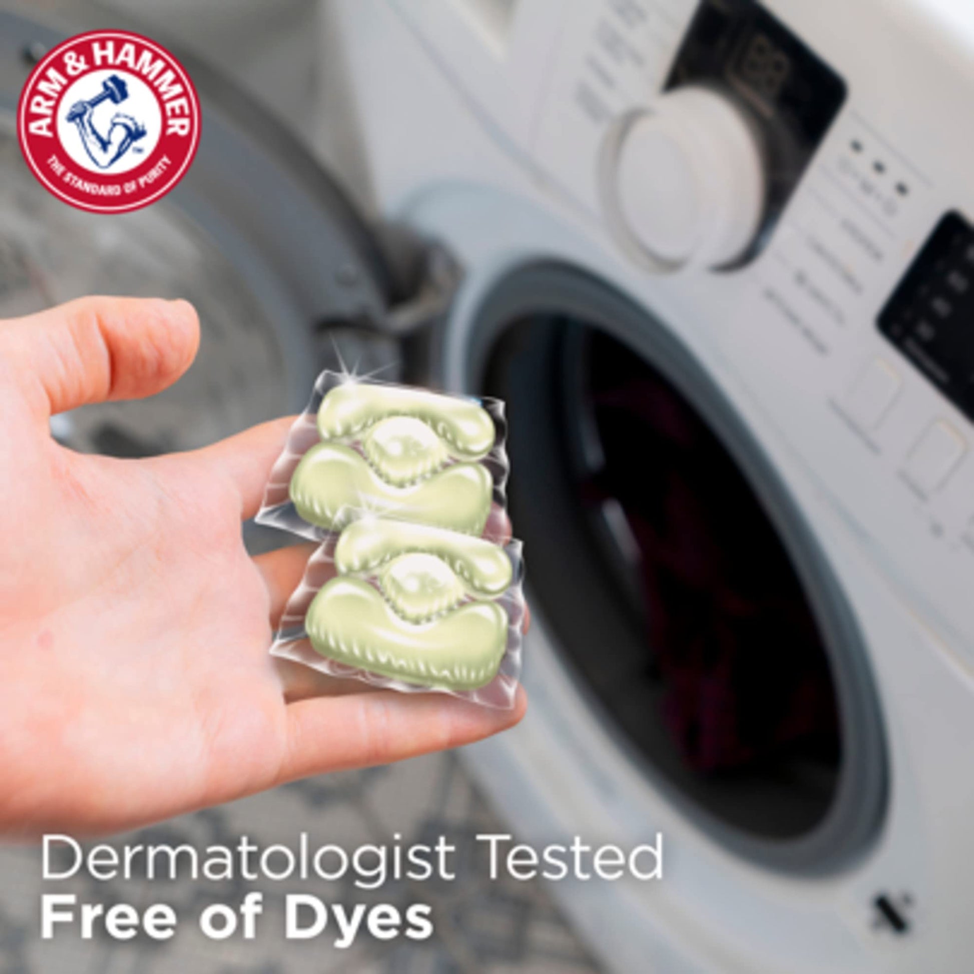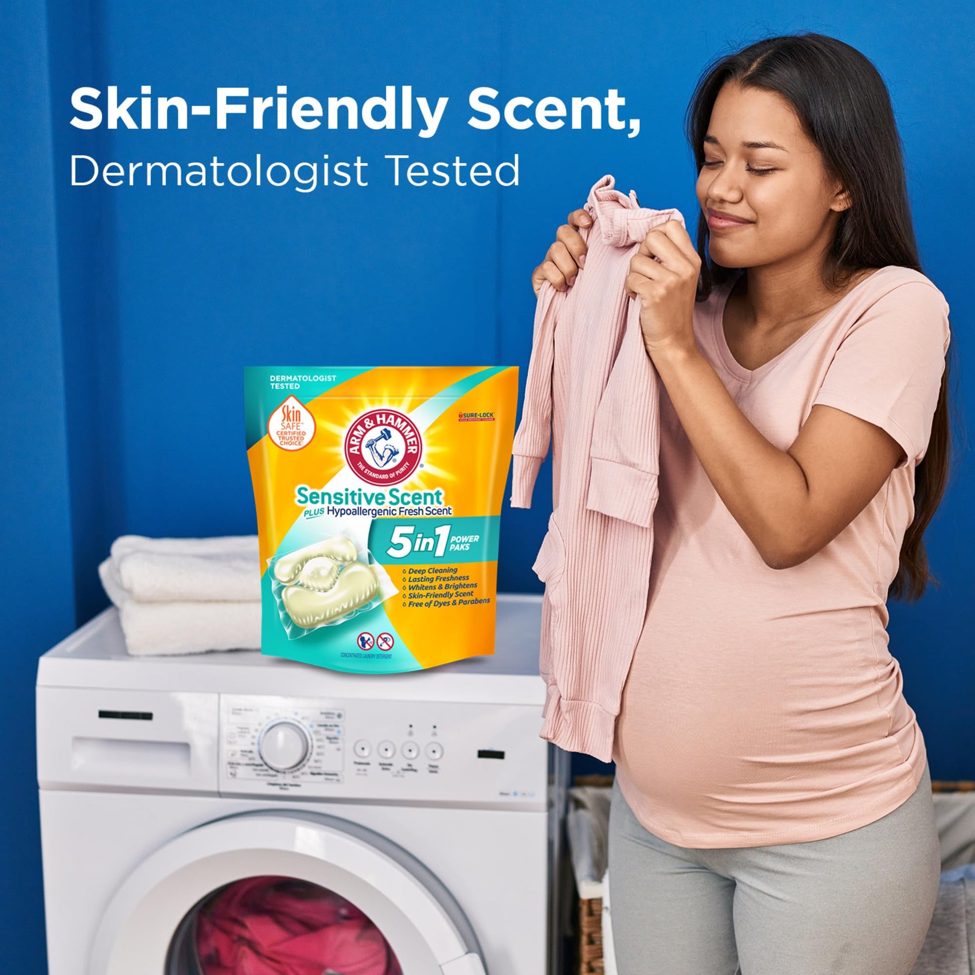 Details: A laundry detergent that delivers 5-in-1 cleaning power with a hypoallergenic skin-friendly scent—it’s all here in ARM HAMMER Sensitive Scent 5-in-1 Power Paks. This concentrated laundry detergent offers 5 powerful cleaning benefits in 1: deep cleans, whitens whites, brightens colors, fights odors with a dermatologist-tested, skin-friendly fragrance, and delivers ARM HAMMER freshness, all without the use of irritating dyes. This dye free laundry detergent is specially formulated to work in both standard washers and today's energy-conscious High Efficiency (HE) models. It is a laundry wash detergent free of dyes that has a fragrance designed and clinically tested to be gentle on sensitive skin. This dye free laundry detergent helps fight tough dirt and odors all with a light, skin-friendly scent that leaves clothes smelling great. Get effective cleaning power with ARM HAMMER Sensitive Scent 5-in-1 Power Paks, designed to work in all temperatures and all machines. Drop one in today!