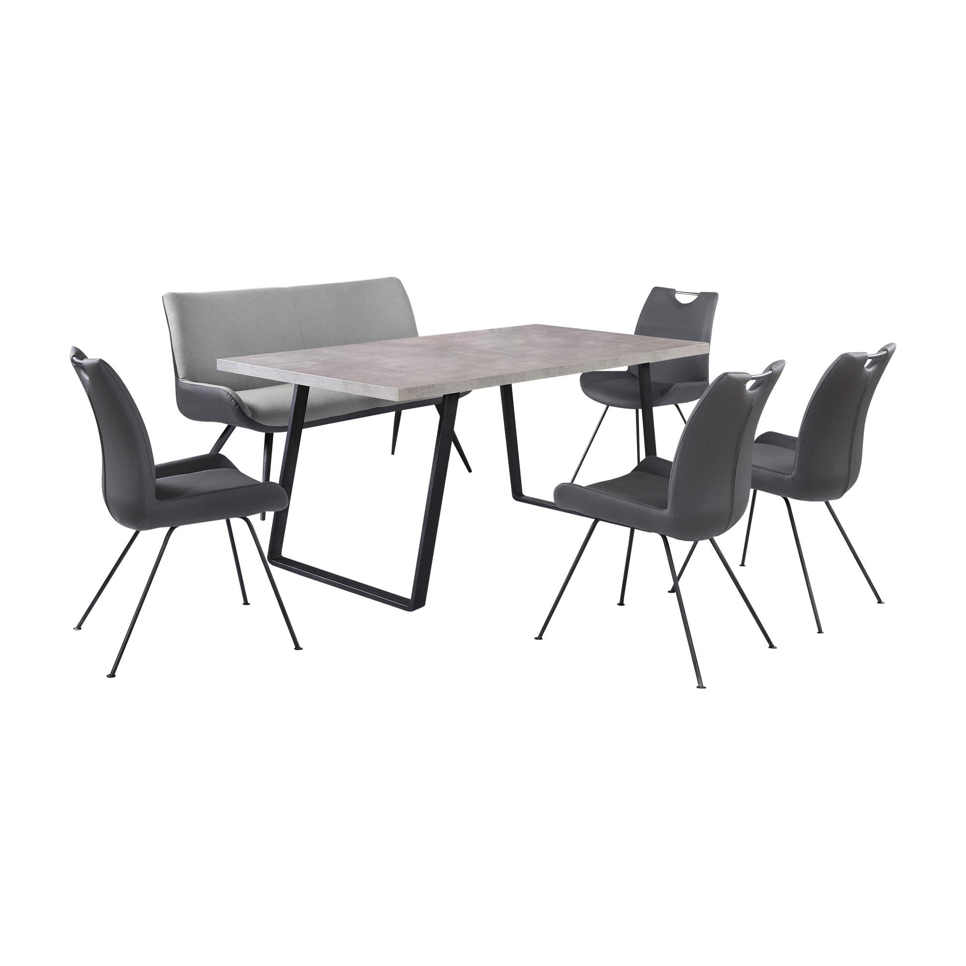 Details: The Armen Living Coronado 6-piece dining set is both simple but elegant look that will complete any contemporary style dining room. The 6-piece set includes: The Coronado dining table, 4 faux leather dining chairs, and grey fabric/faux leather upholstery dining bench. The table has sleek metal base, complimented with a beautiful grey concrete laminate top. The Coronado dining chairs are complimented with soft faux leather upholstery for optimum comfort. The Coronado set is practical, yet highly appealing, making it the ideal combination for any contemporary dining room. We stand by the quality, the craftsmanship and the integrity of our product by offer 1-year warranty for all our products.