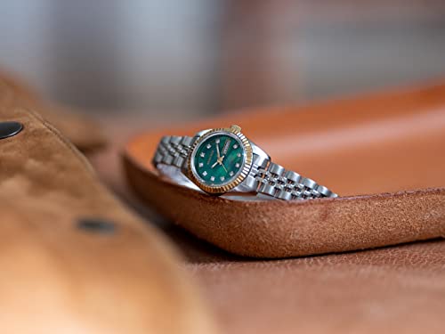 - Green mother-of-pearl dial with day/date calendar window; gold-tone luminous hands and genuine clear crystal markers