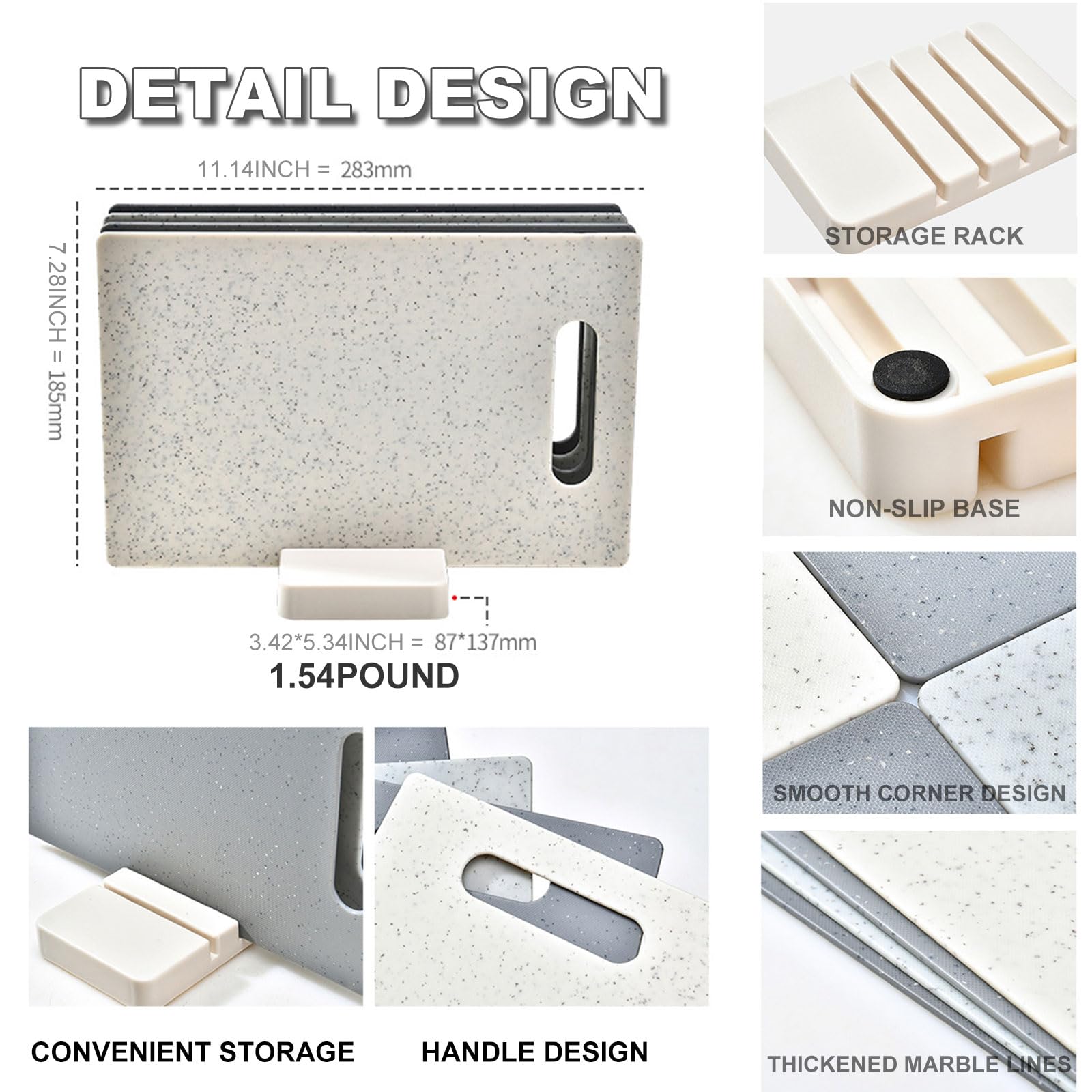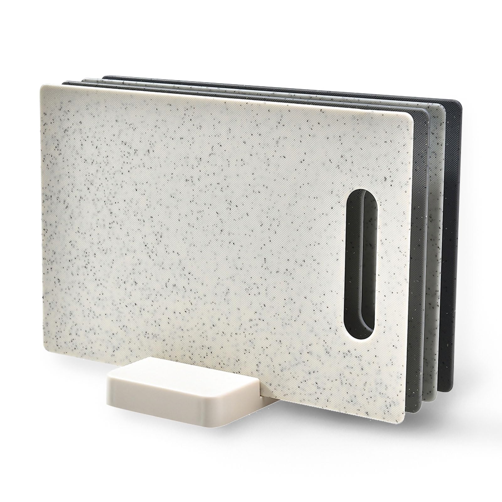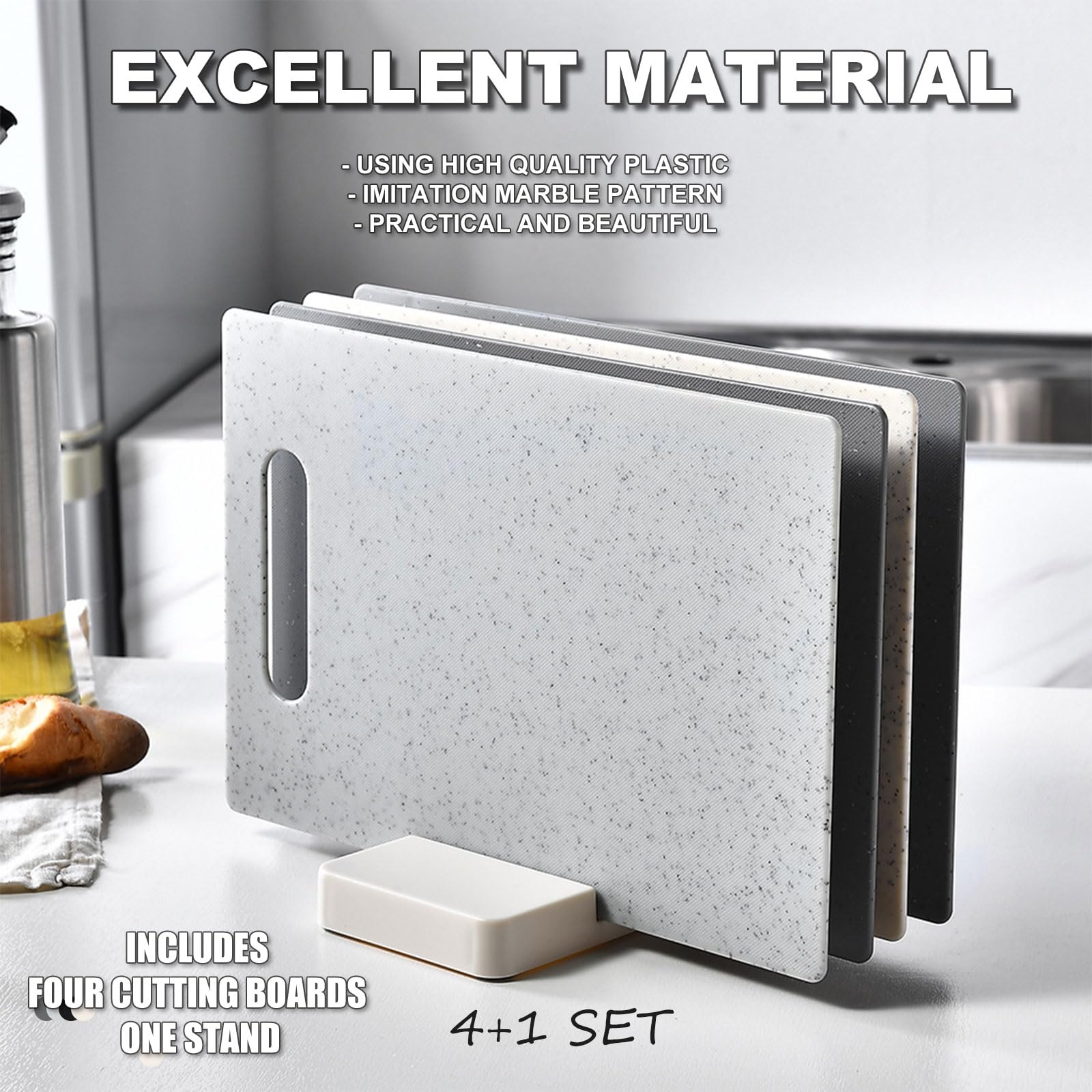 - 2.Convenient Stand:This 4-piece set comes with a practical stand, providing a space-saving storage solution.The stand keeps your cutting boards organized and within easy reach, saving valuable countertop space in your kitchen.
