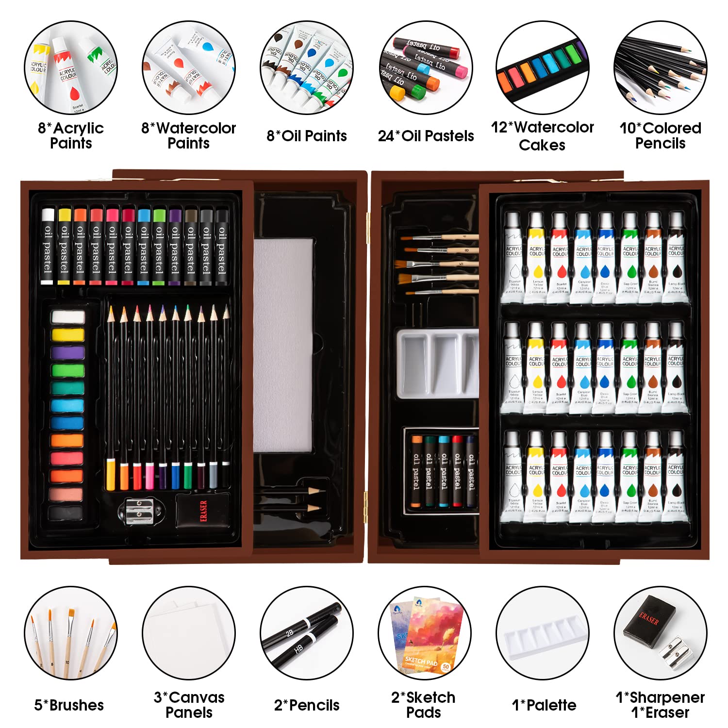 - 【DISCOVER ARTISTIC TALENT】The multi-functional art kit contains various drawing and painting supplies, and is the best art set for hobbist to show art talents. This art box is a good enlightenment kit. Students and beginners can try to use acrlic paint, color pencils, watercolor cakes and oil pastels to become famous artist step by step!
