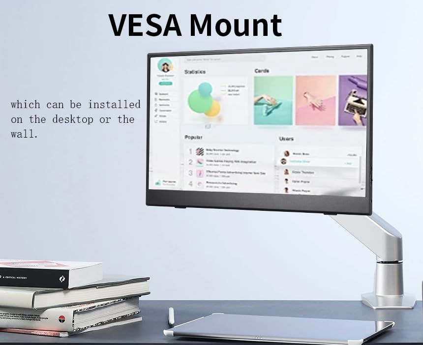 - DURABLE SMART COVER -ARWOEIS Travel Monitor, Comes with a scratch-proof smart cover made of durable PU leather exterior, doubles as a stand, provides comprehensive protection for this portable computer monitor. can work in both landscape and portrait mode, can be used as a gaming monitor, screen extender for laptop or phone. There are two grooves in the cover base to give at least some choice of viewing angle for your comfort,ARWOEIS protable monitor It has four holes in the back,It be a VESA mounting point.