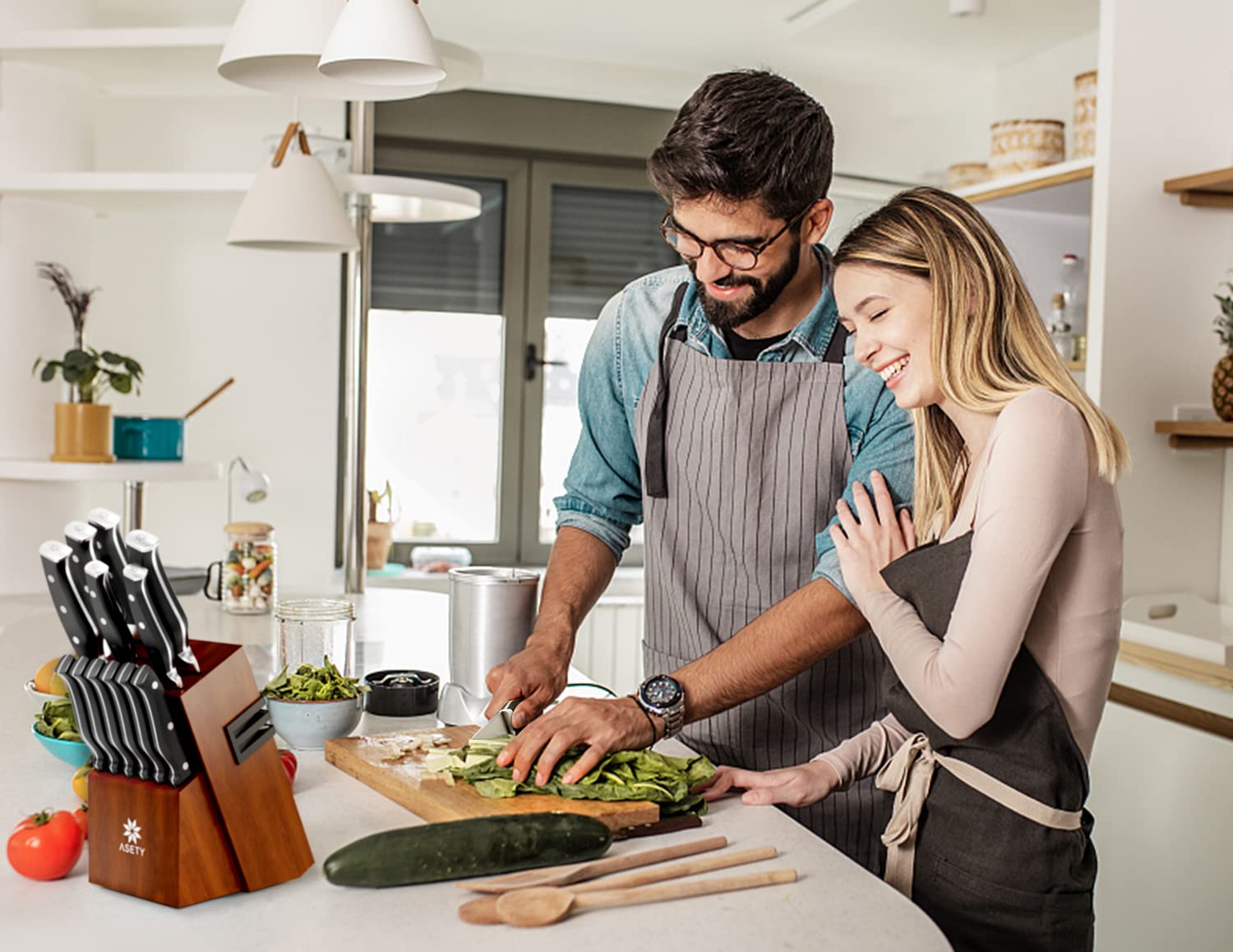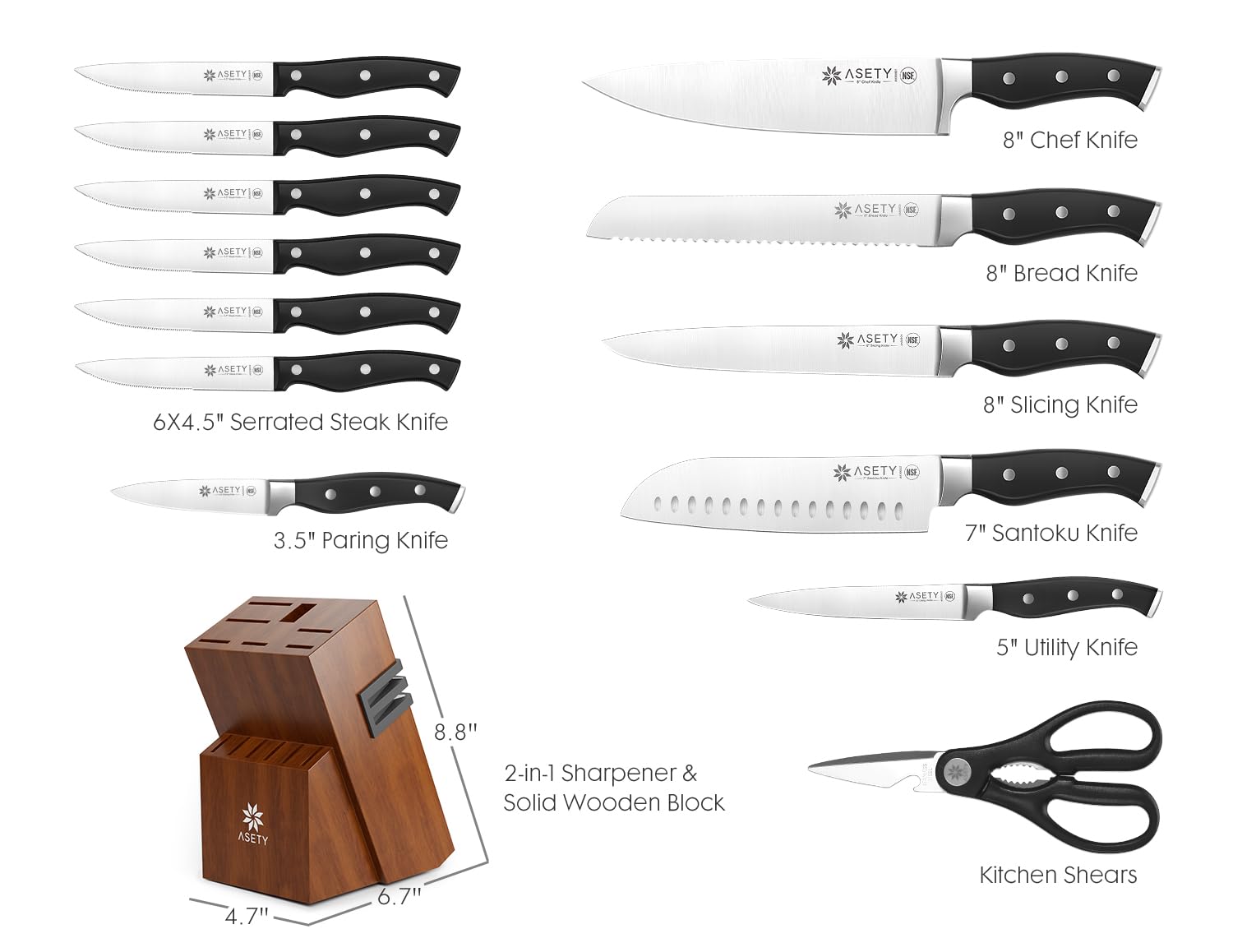 ASETY Knife Set, 15 PCS Kitchen Knife Set with Built-in Knife Sharpener Block, German Stainless Steel Knife Block Set, Full Tang Chef Knife Set, NSF Food Safe, Gift for Men I Women