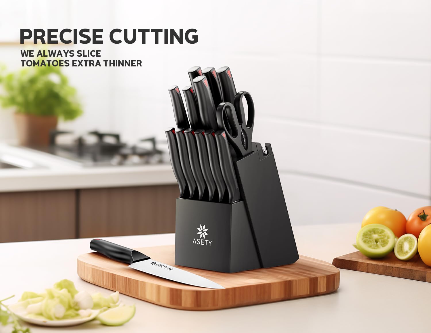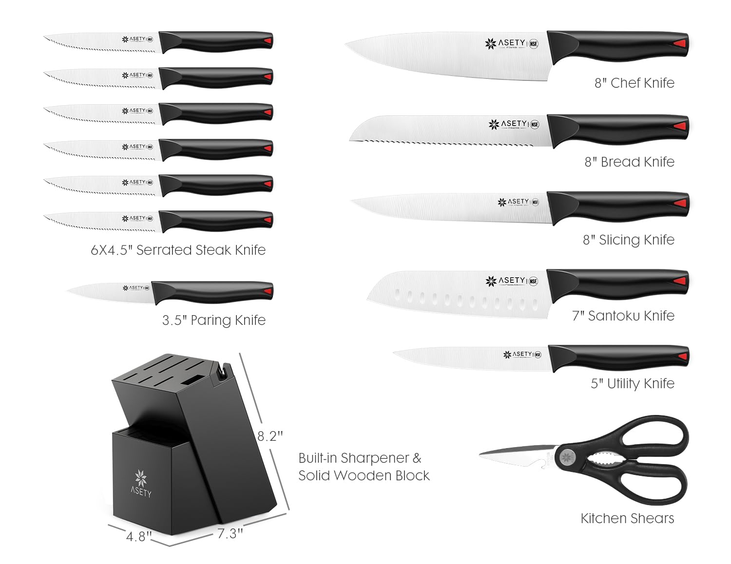 ASETY Knife Set, 15 PCS Kitchen knife Set with Bulti-in Sharpener Block, High Carbon Stainless Steel Knife Block Set, NSF Food Safe, Dishwasher Safe Knife Sets for Kitchen, Black, Gift Box