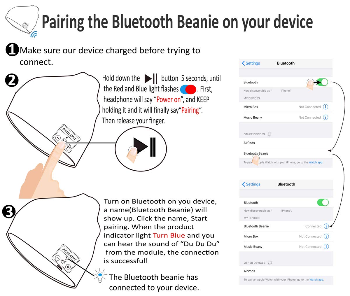 - Step 3: Turn on Bluetooth on your device, then a name(Bluetooth Beanie) will show up under your Bluetooth devices. Click the name, Start pairing. When the product indicator light turn blue and you can hear