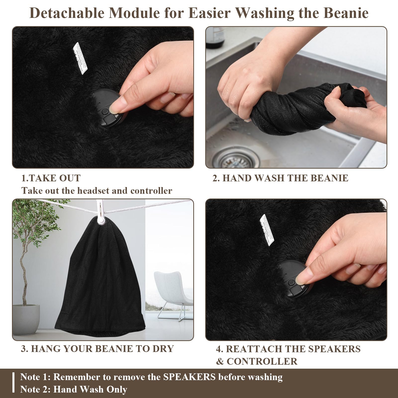 - ✔Easy to Use and Wash the Bluetooth Beanies - The simple panel display on the ear of the Bluetooth wireless beanie has 3-prompt buttons and an LED indicator light. Go pass the basic controls of pausing/playing music and be able to answer calls, skip songs, and control the volume. Our beanie with Bluetooth features headphone slits that make the headphones easy-to-remove and reinstall so that you can wash your beanie. Hand-washable after removing the Bluetooth speaker modules.