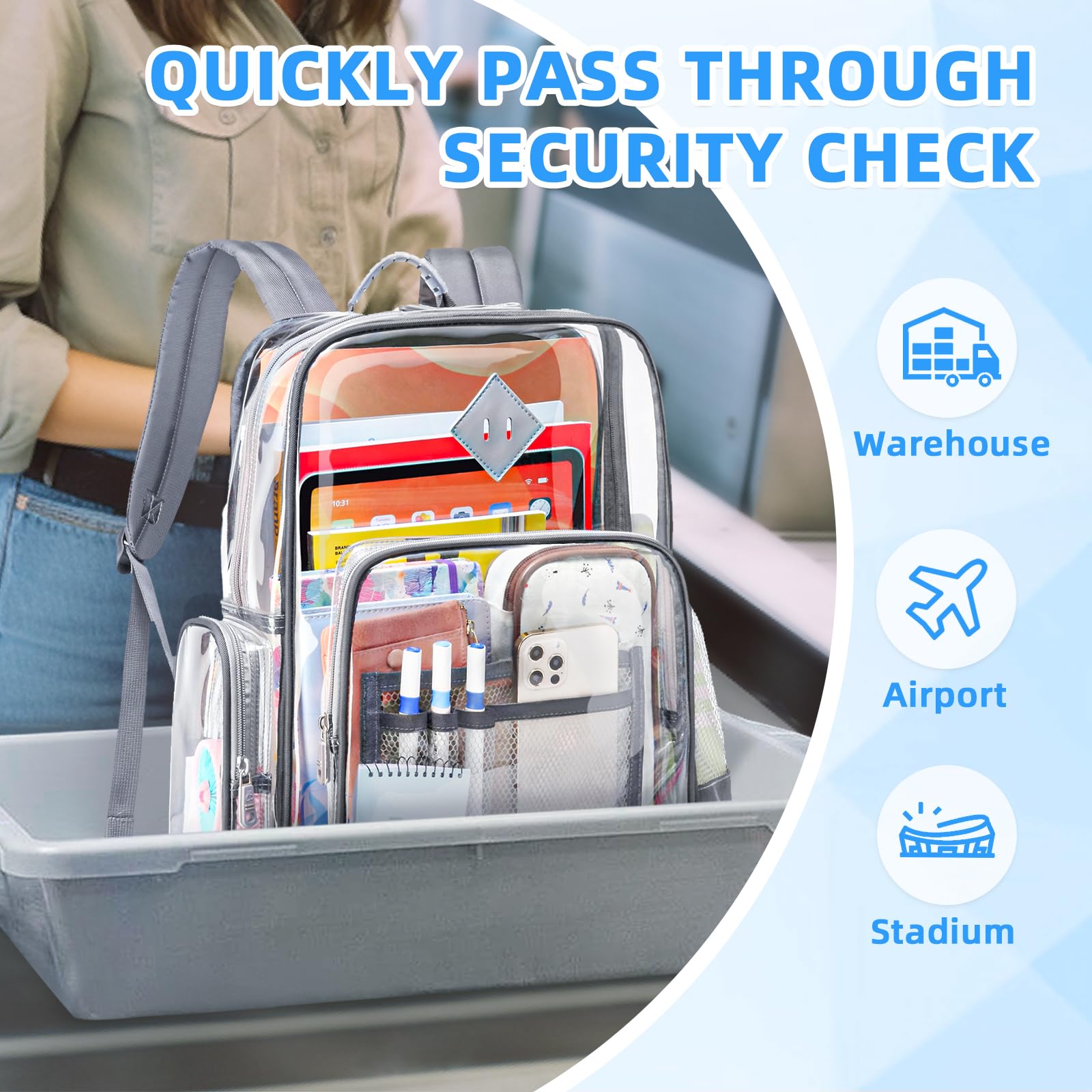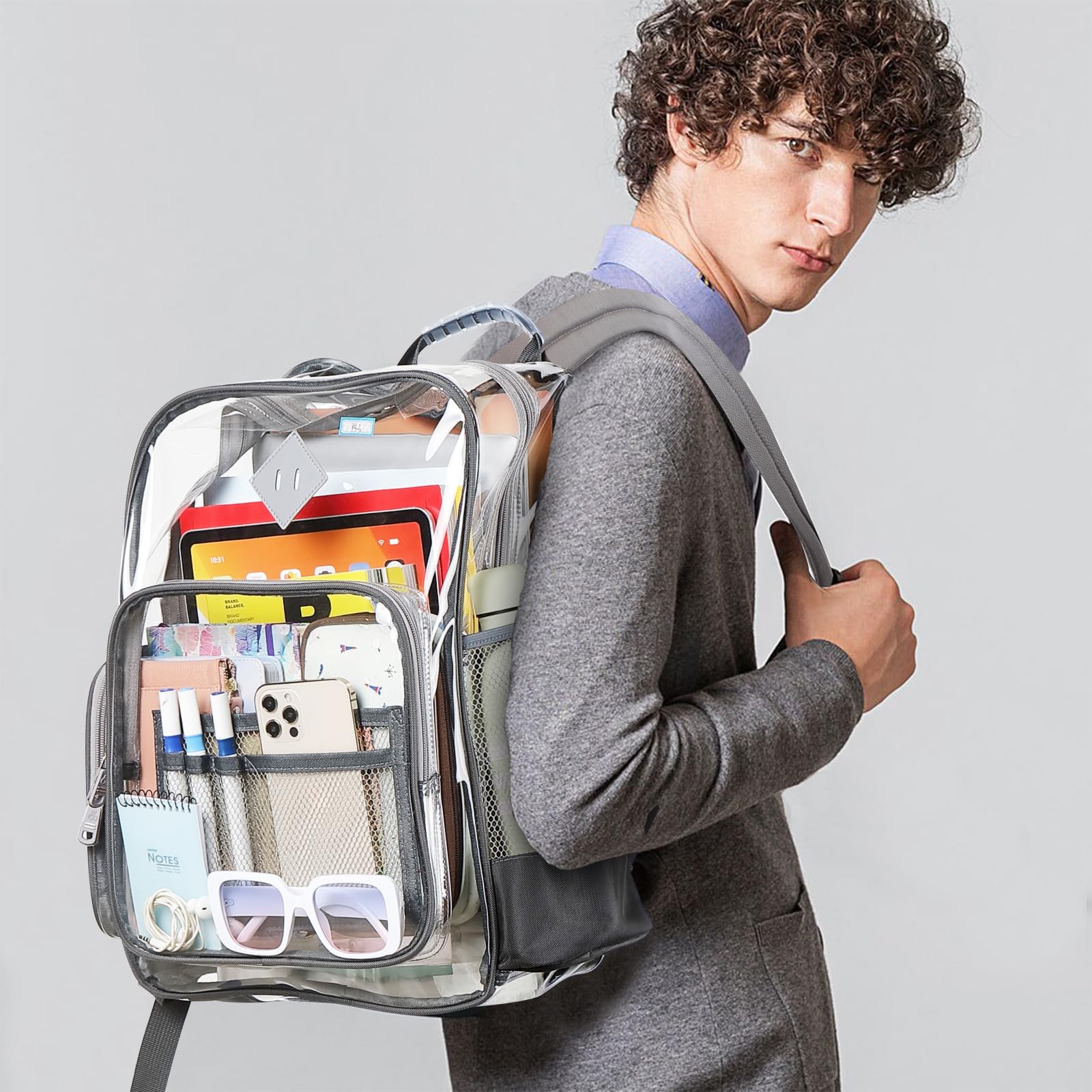 ASKSKY Large Clear Backpack for Men, Heavy Duty PVC Transparent Bookbag for Women Stadium Approved See Through Back Pack Fits 16 inch Laptop for School Work Travel, Gray