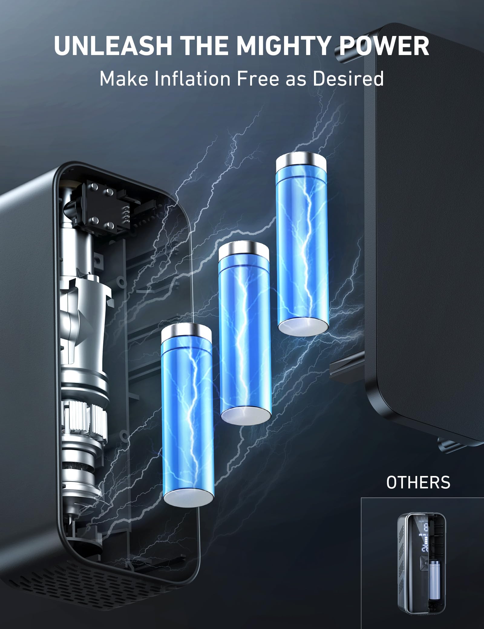 - EXTENDED BATTERY PERFORMANCE: The L4 Air Compressor has a large 6600mAh battery capacity that unleashes massive energy and extends usage time. You can inflate 12 car tires (195/55/R15) over its 40-minute non-stop runtime with just one full charge. Say goodbye to quick battery draining, and insufficient power.