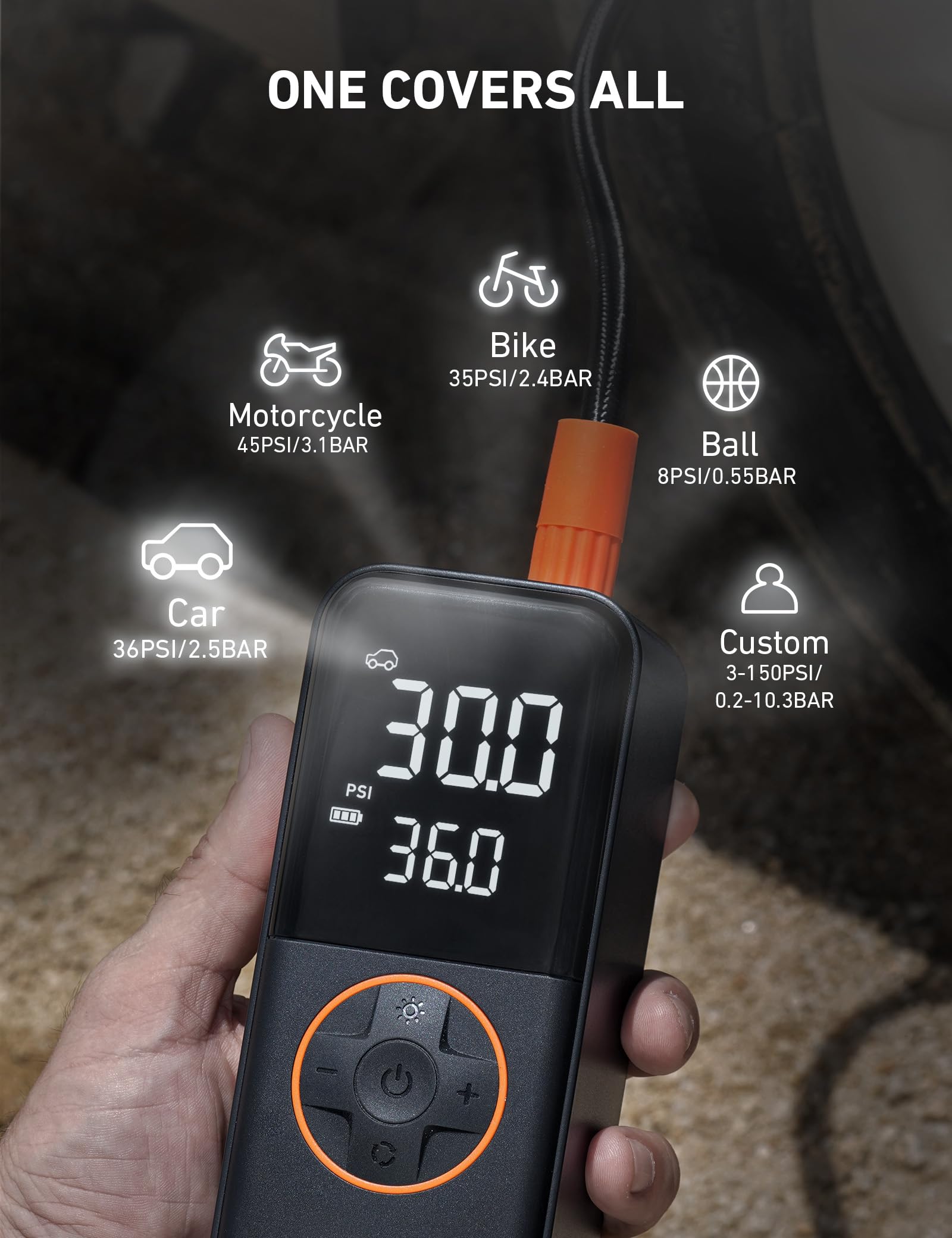 - 5 INFLATION MODES: The L4 Air Compressor provides 5 smart inflation modes (car, motorcycle, bike, ball, and custom) and 4 pressure units (PSI, kPa, Bar, kg/cm²). These beginner-friendly presets, and the manual custom mode, allow you to preset the pressure value according to your needs.(NOTE: NOT RECOMMENDED FOR TRUCK VEHICLES)