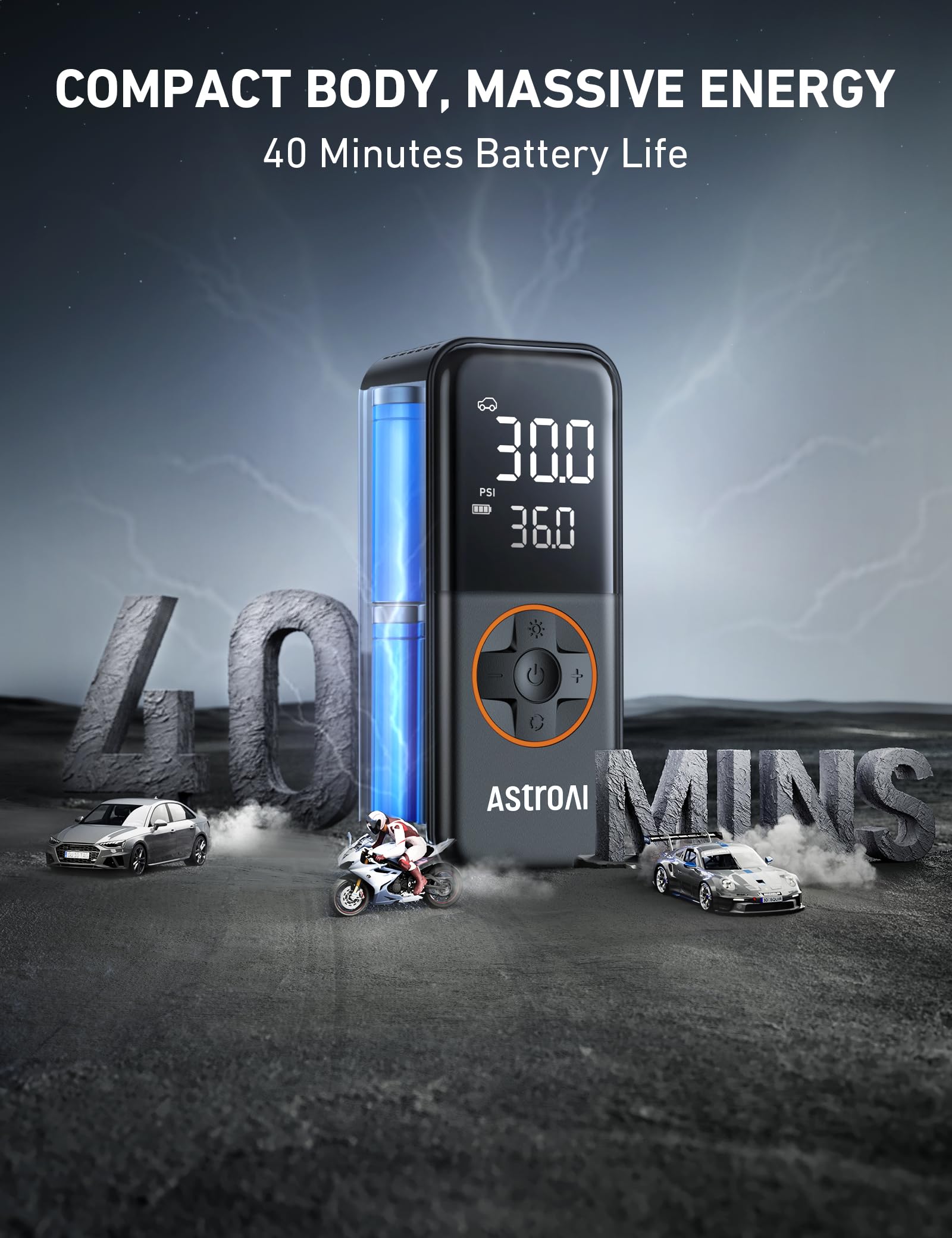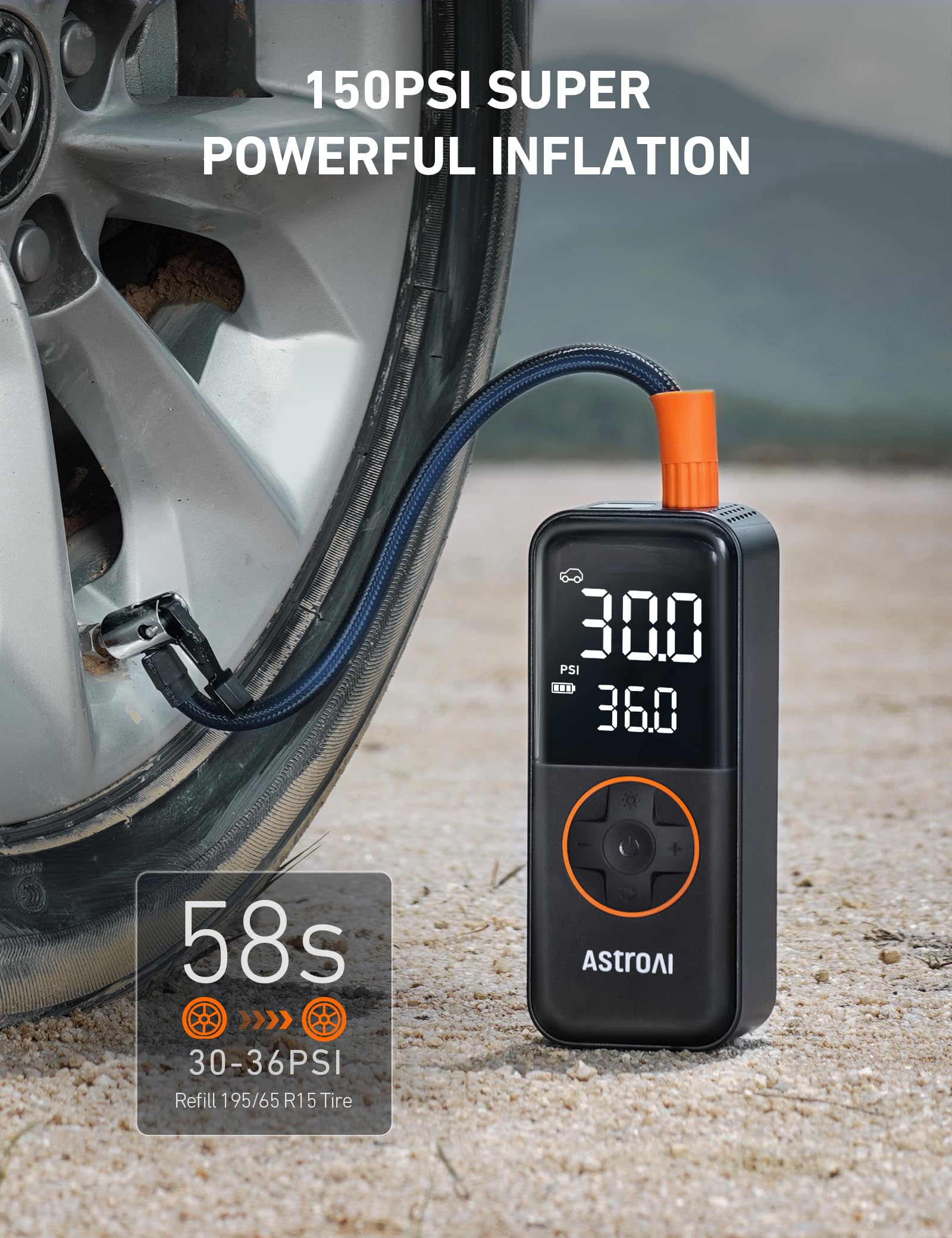 - HIGH-SPEED TIRE INFLATION: The AstroAI Portable Air Compressor delivers powerful inflation up to 150PSI. It can quickly refill a car tire (195/65 R15) from 30PSI to 36PSI in just 58 seconds. This portable tire inflator is a must-have for emergency preparedness and efficient refilling.