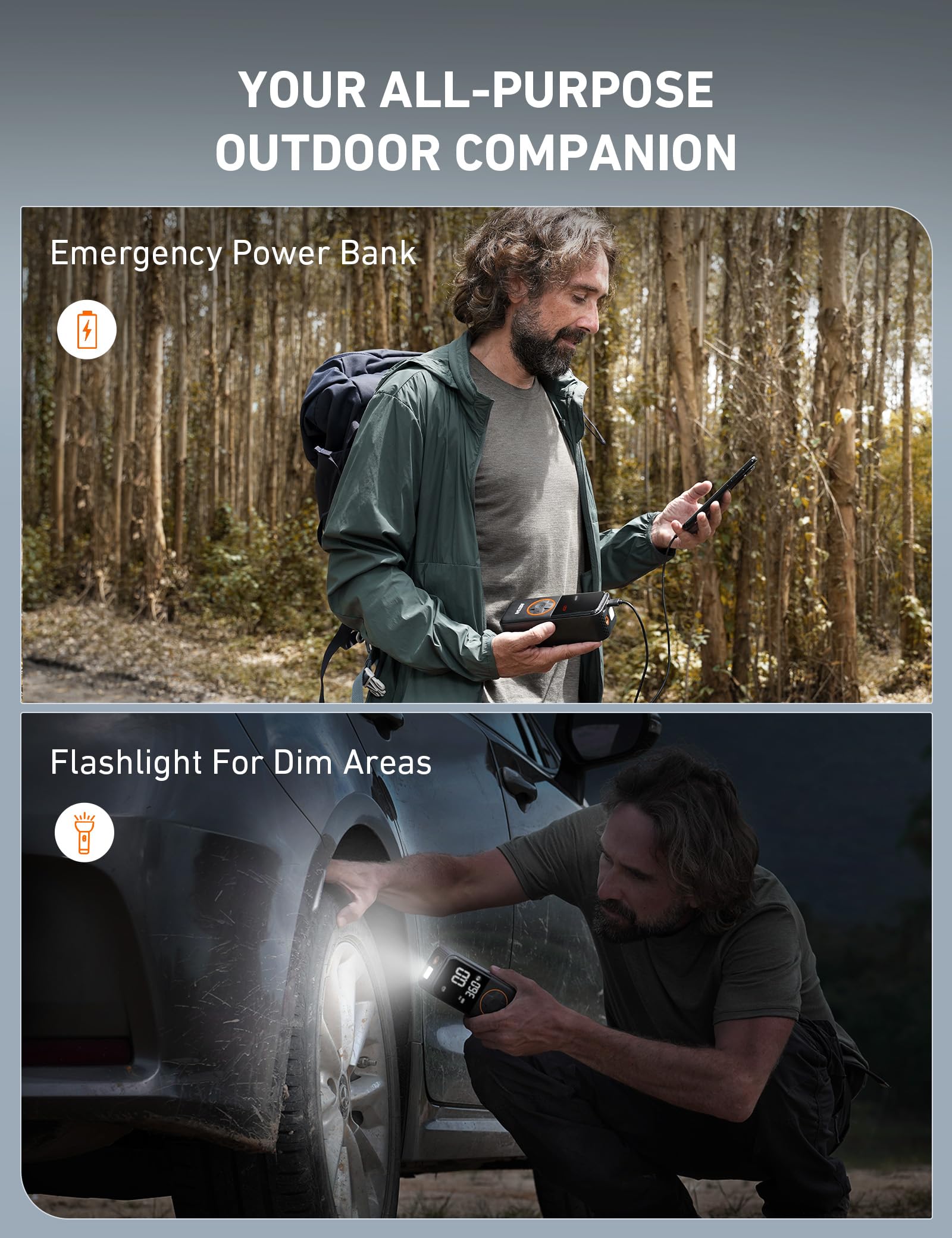- FOR MULTIPURPOSE USE: Thanks to its 3 light modes (SOS, flashlight, and strobe), the L4 Air Compressor makes it easy to handle any outdoor activity. Its USB output also works as a power bank, even if your phone dies while you’re off-grid.