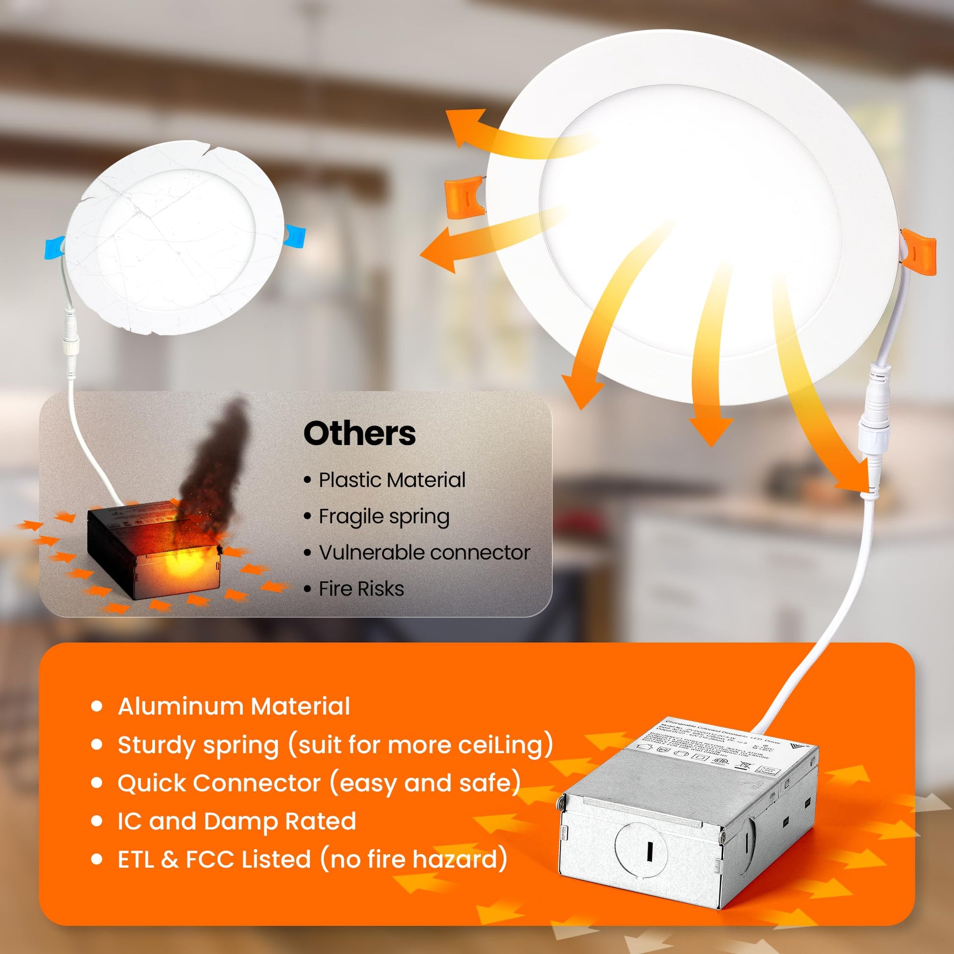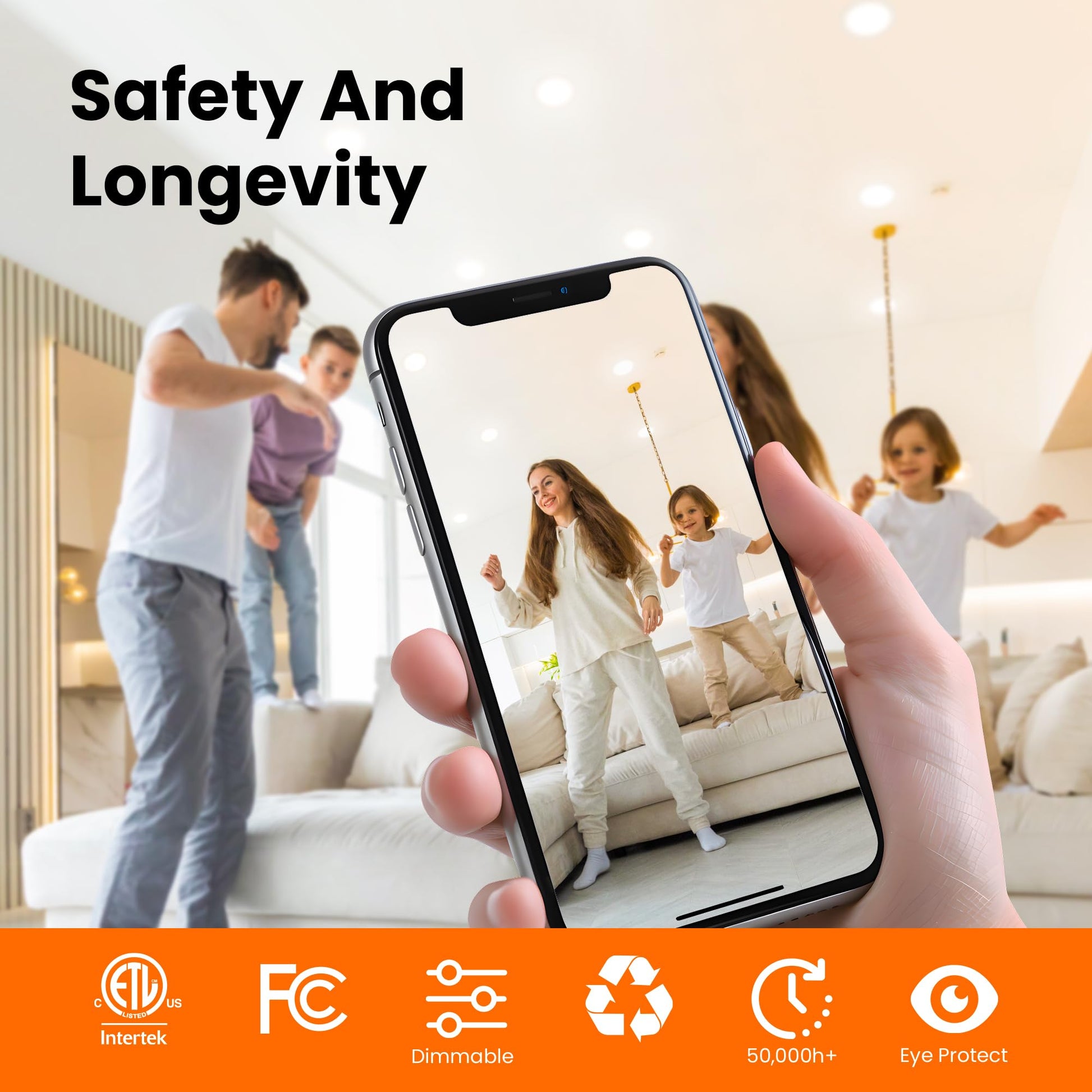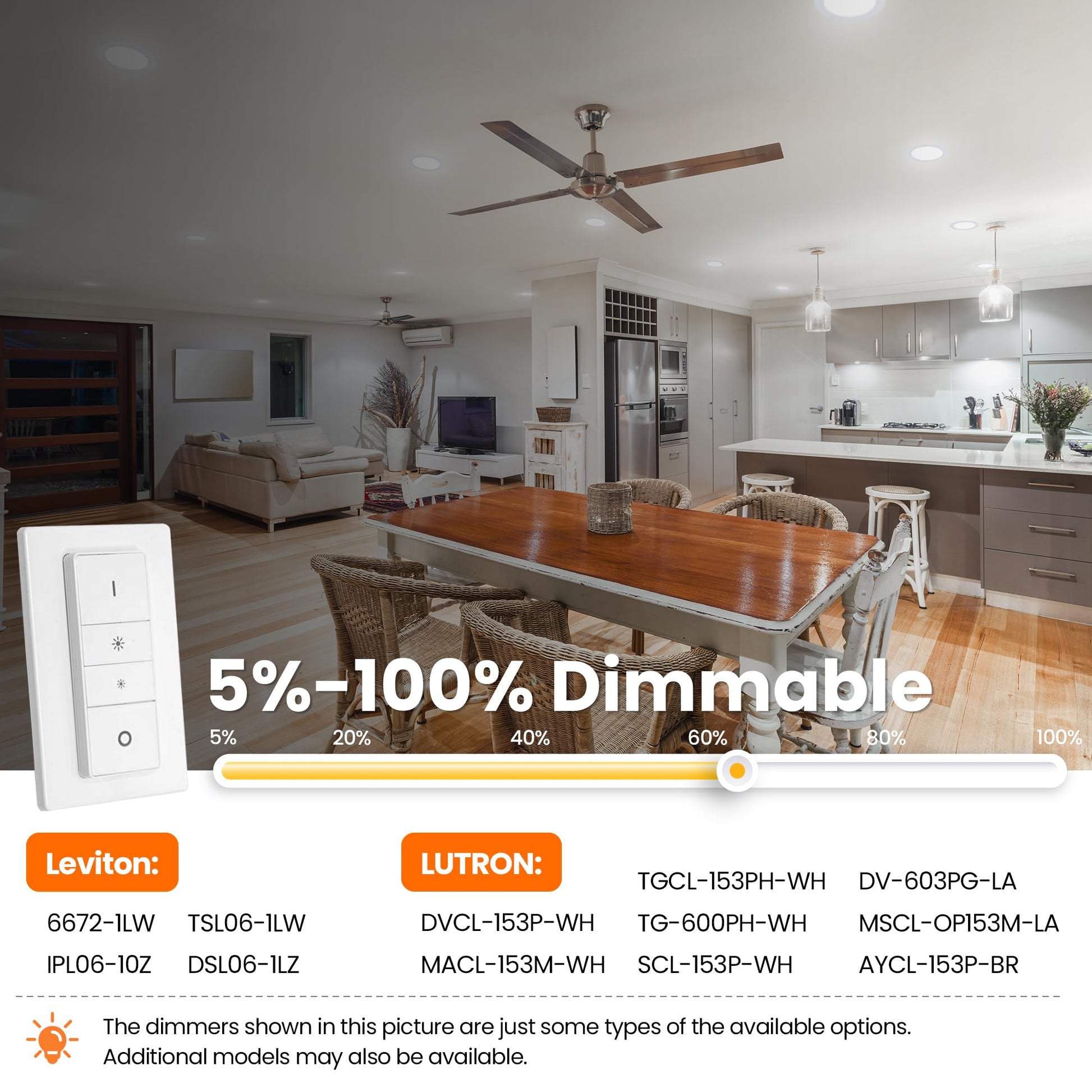 - High Brightness: Illuminate your space with these recessed lighting 4 inch featuring high brightness, smooth 5%-100% dimming, and energy-efficient design: 900LM, 9W consumption, saving up to 90% in energy costs without compromising on brightness.