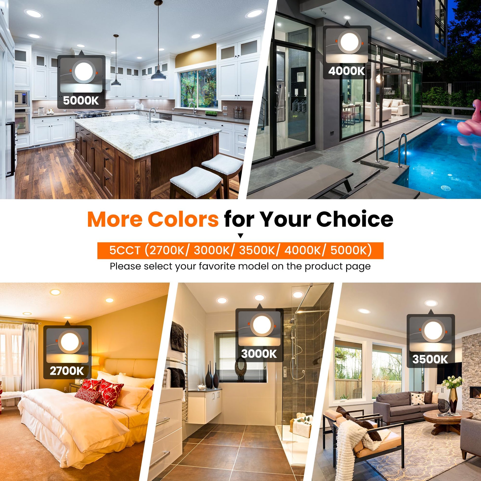 - 5CCT in 1: AUDERWIN Recessed Lighting offers a convenient solution with 5 different colour temperatures (2700K, 3000K, 3500K, 4000K, 5000K) by simply switching the J-box to suit any room type, eliminating the inconvenience of returning products.